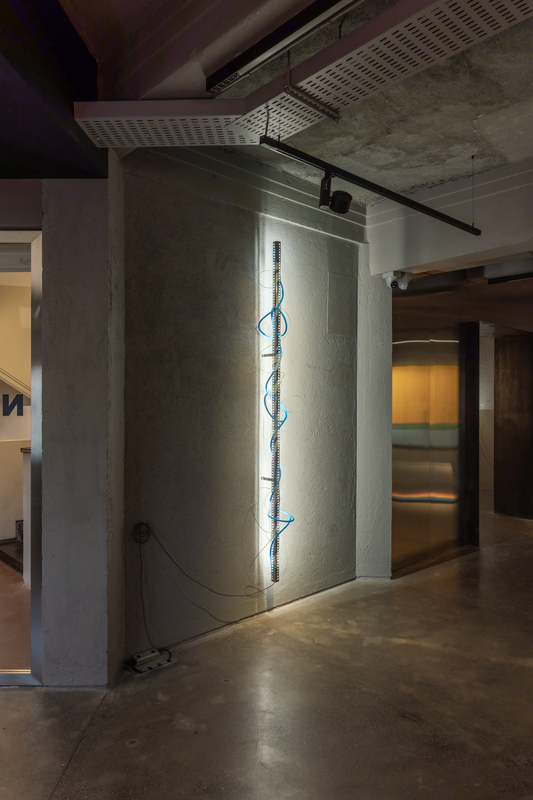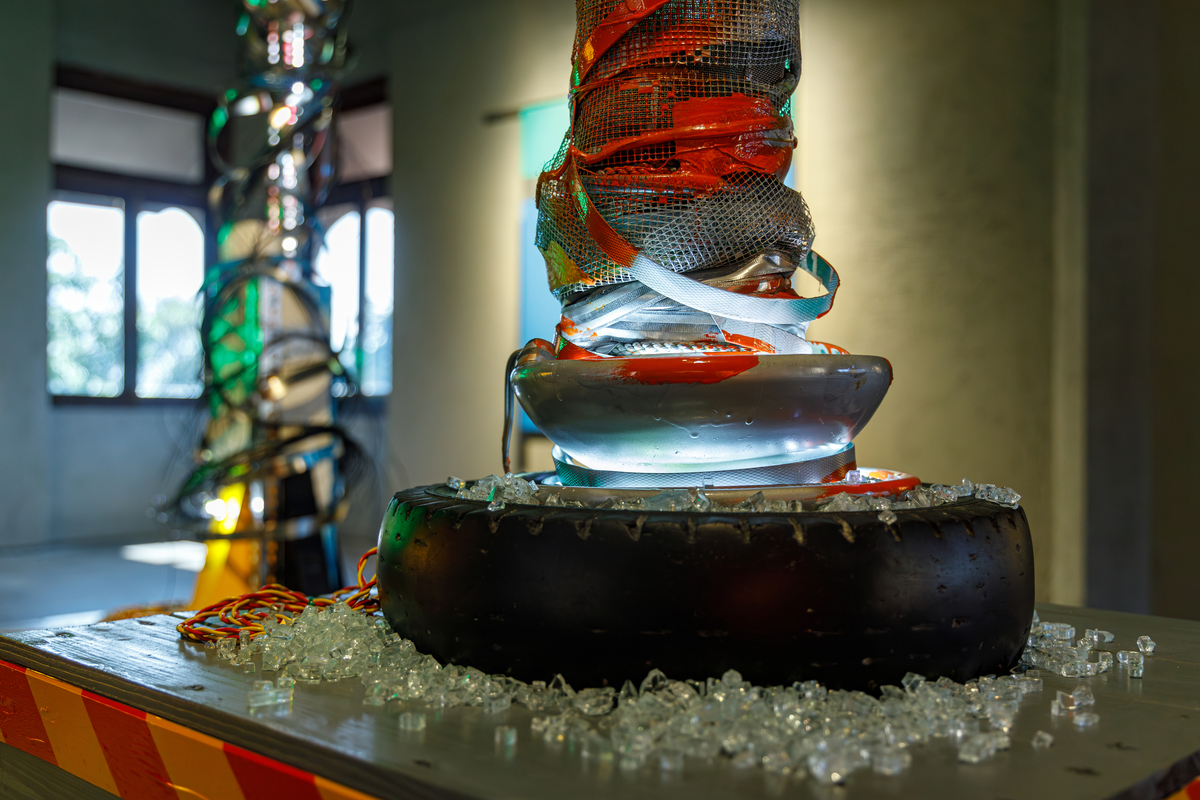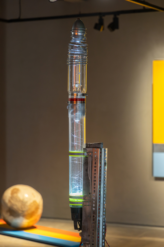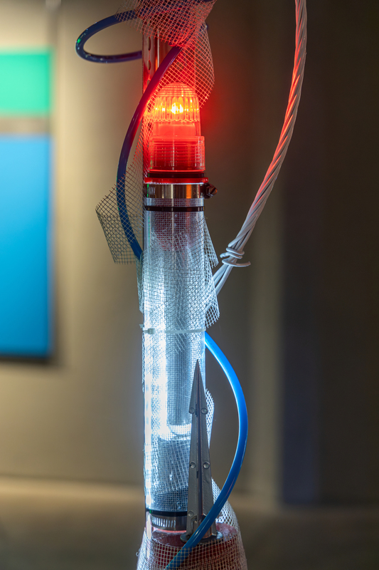 Prime’s sculptures appear to be strange hybrids of the past and the future. Constructed entirely of recycled and industrial materials, they mimic an architectural presence while also alluding to the myriad types of constructions that humans send out into space. Most of them are slender and vertical, whether free-standing or wall-mounted, and the artist refers to them as “dystopian tower structures.” Many of the works are electrified and the addition of lights brings both a functional and a ghostly aspect to the works. The roots of these works can be traced to experiments with science and technology by artists of the 1960s (spearheaded by Robert Rauschenberg) as well as the Fluxus Movement.