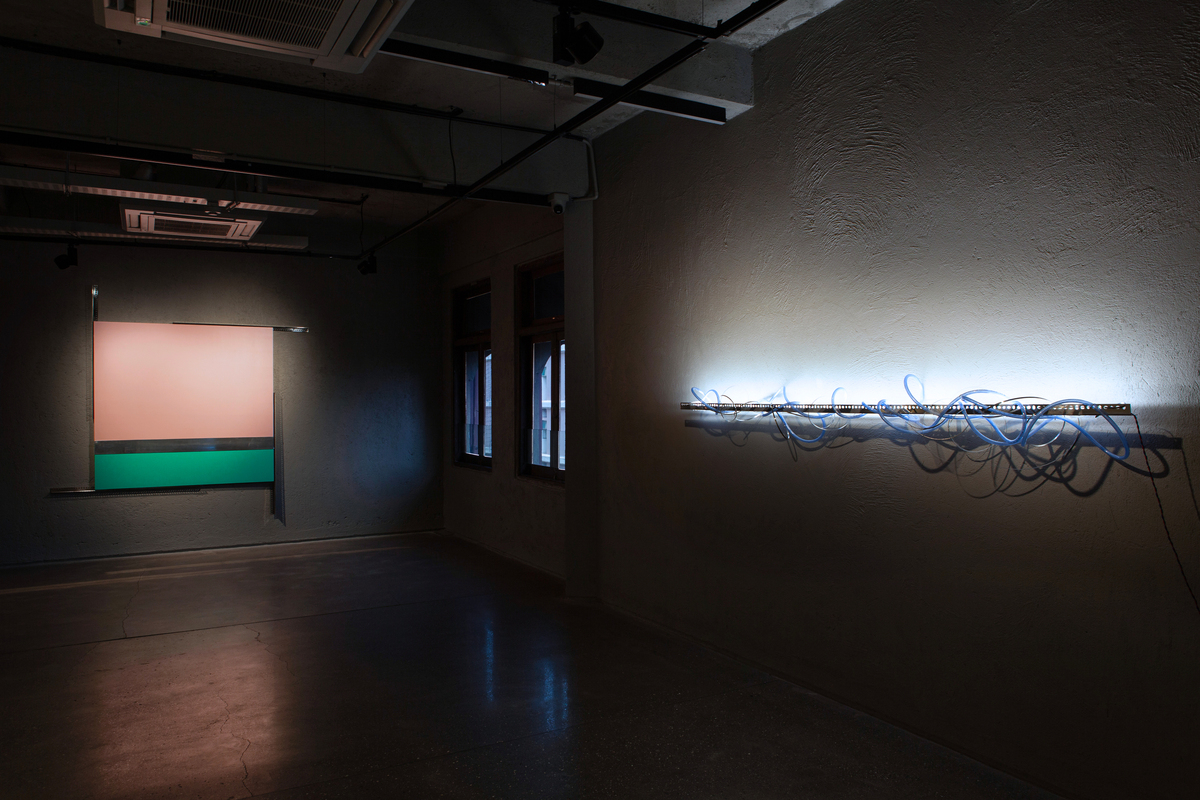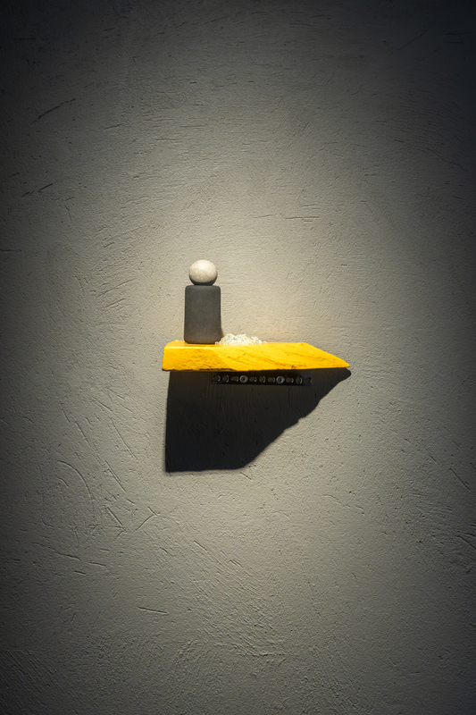 Four paintings are included in the exhibition. These replicate, in both materials and design, the walls of homes found in rural Maharashtra. Aggressive in their simplicity, each painting consists of two solid colors divided by a band of aluminum. An unlikely bridge is created between a history of minimal art in the Western World and the innocent expressions of the vernacular Indian populace. Five photographic works are also included in the exhibition. These portray debris partially buried in the wet sand of the Maharashtra coast. While both elegant and macabre, they speak of environmental degradation but also nature’s strength to resist man’s blunders.