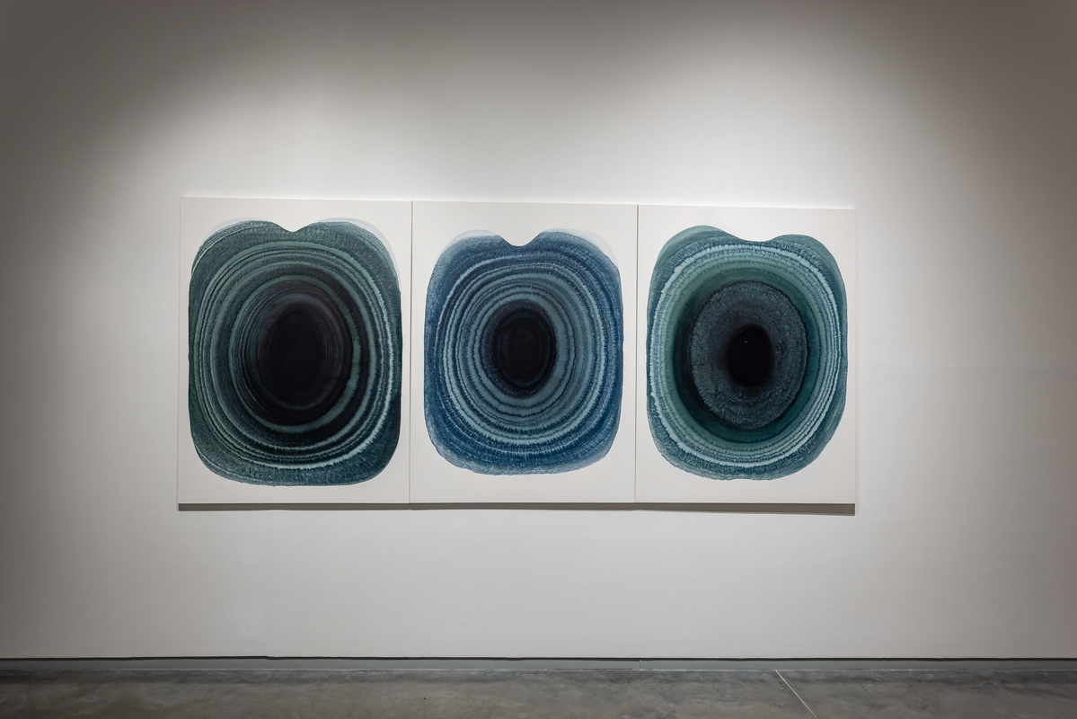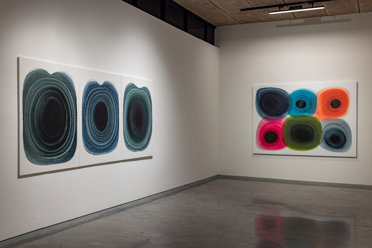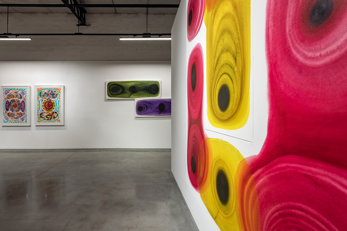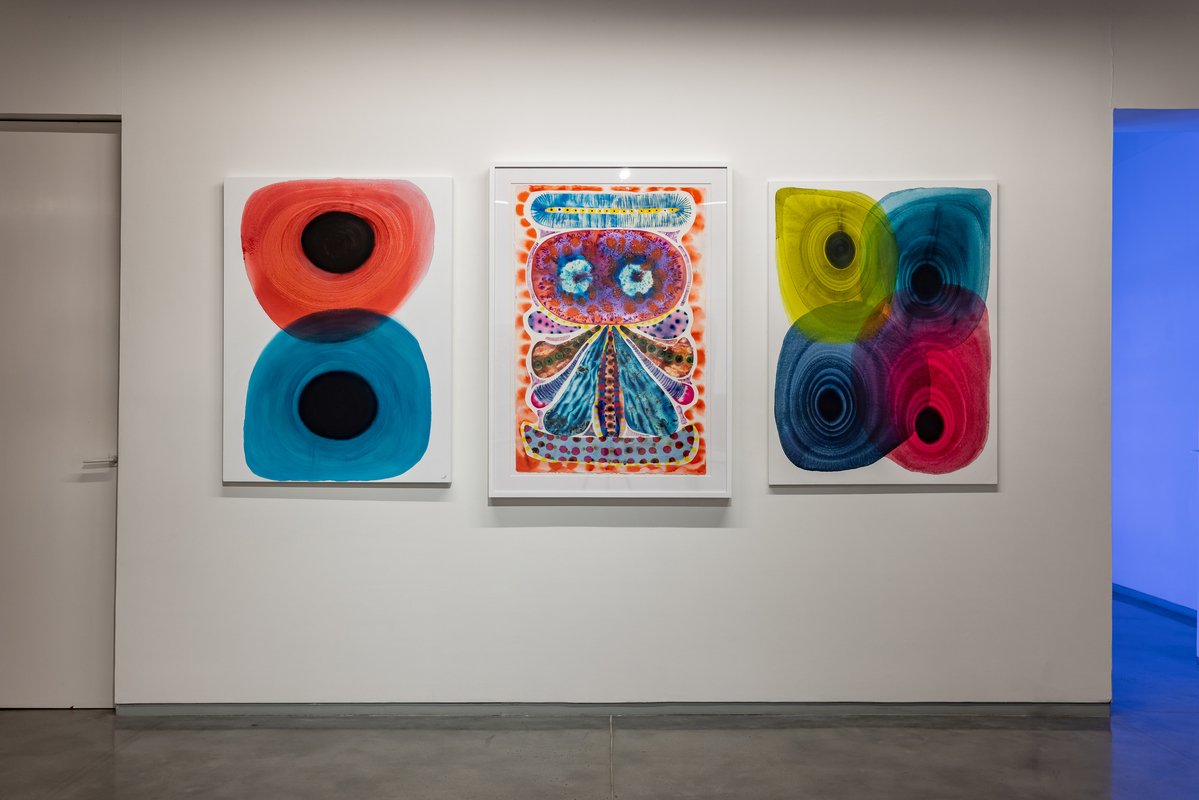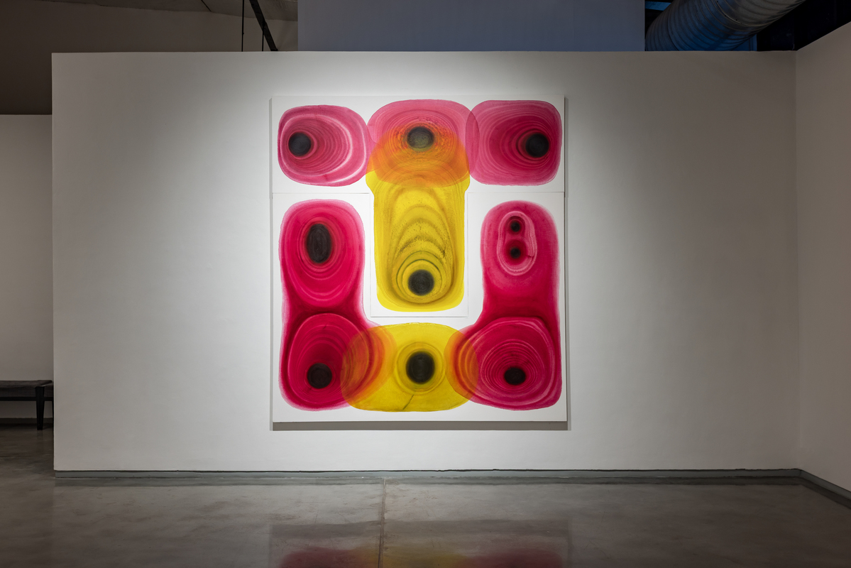 The paintings start with a central focus from which layered forms breathe out of. Classical and controlled, they juxtapose simple shapes in precise colors on white fields which become energized, straining to contain pigments which seem to pulsate. A new development is the use of shaped canvases which combine pools of colors together into complex configurations. The watercolors on paper allow the artist additional freedom, spontaneity and serendipity, which are integral to their creation. For the first time, she has transposed the watercolors on to acrylic sheets, transforming them into the shaped lightboxes.