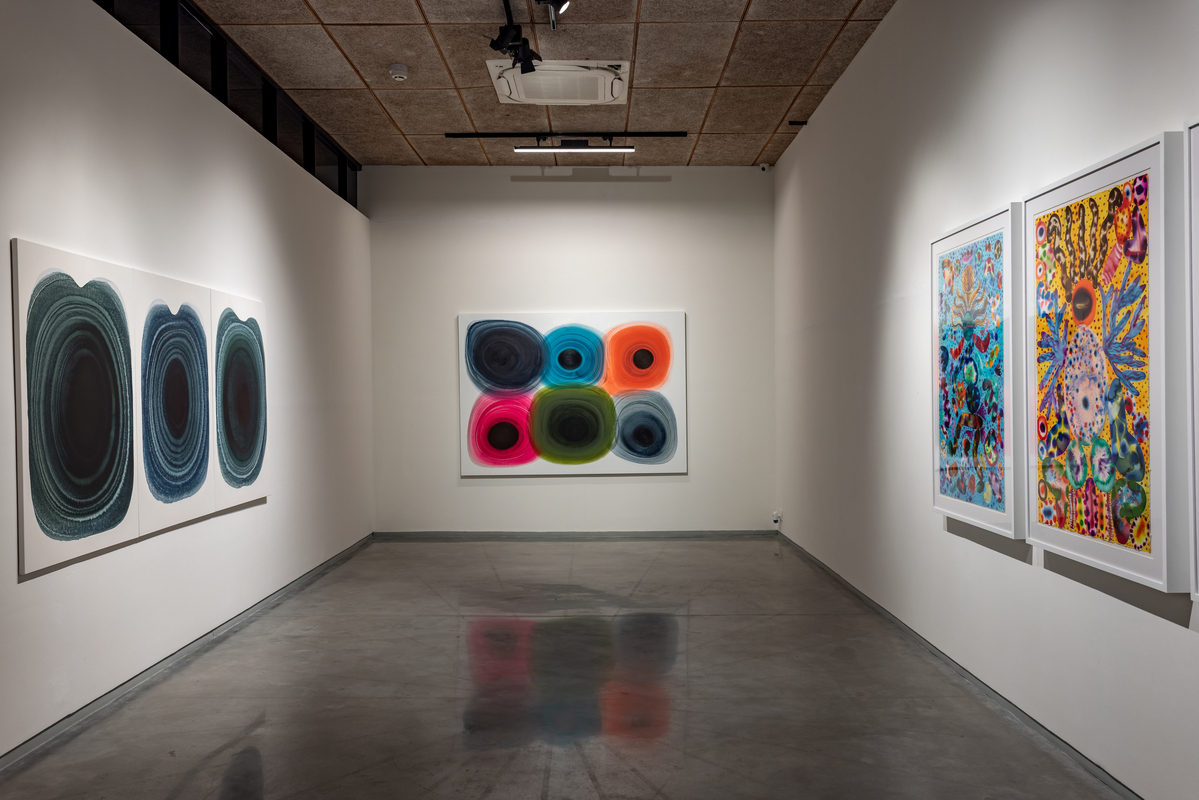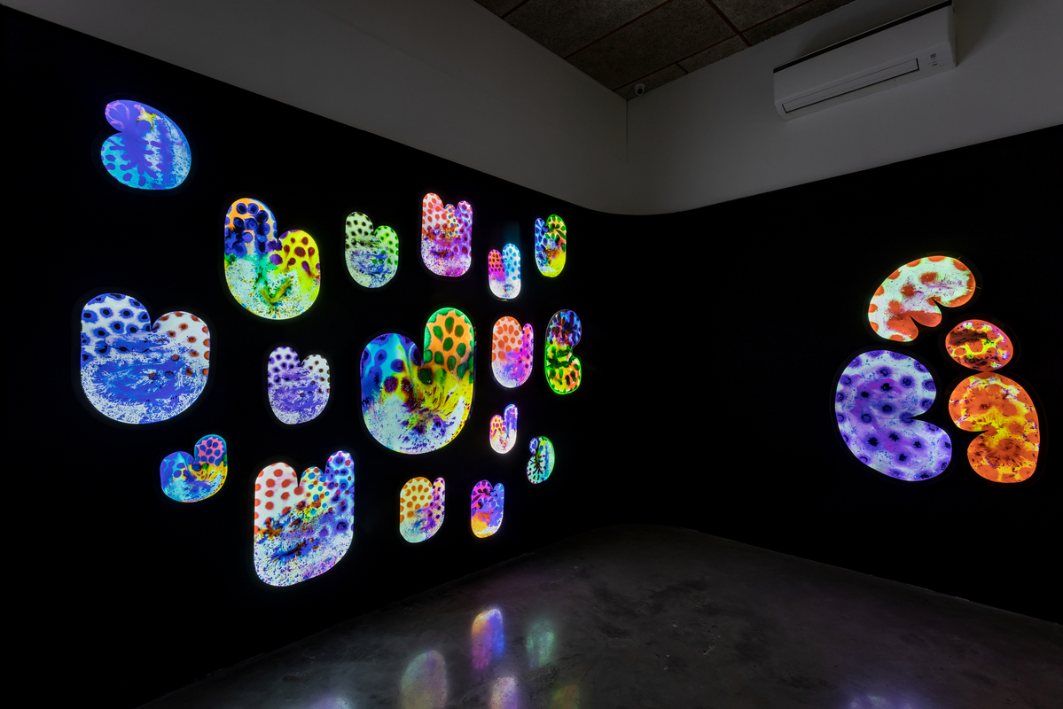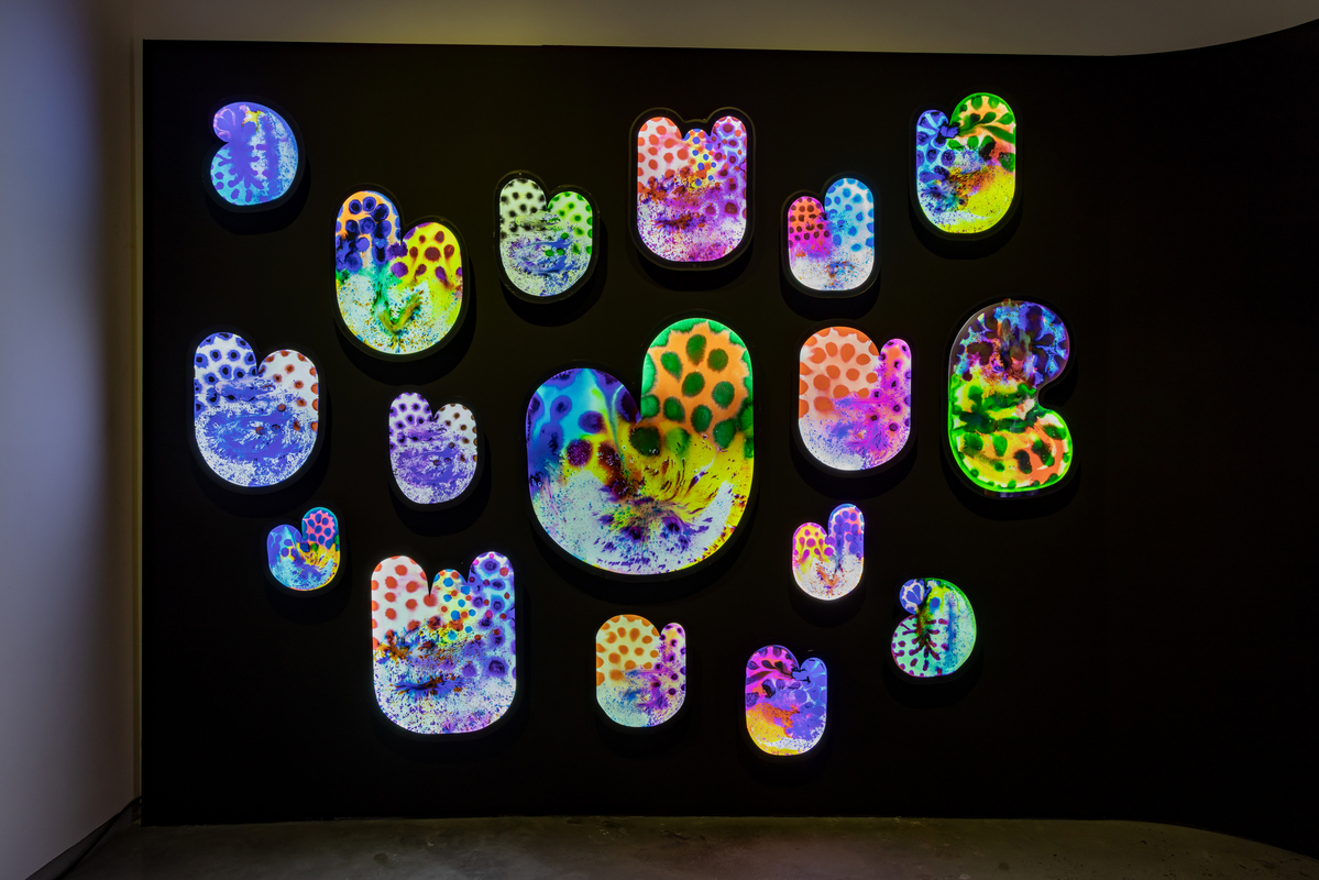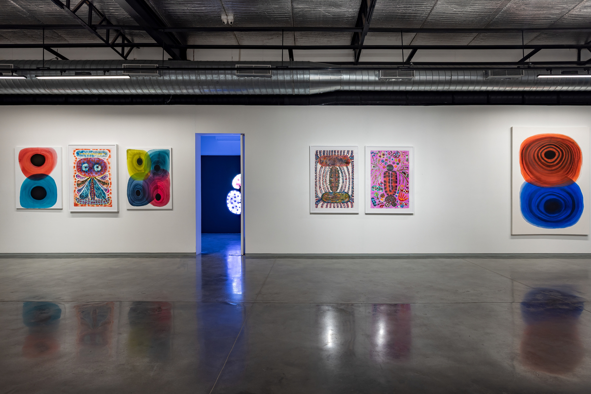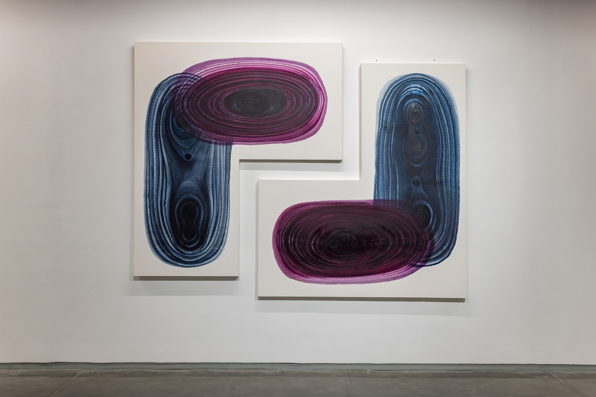 The paintings start with a central focus from which layered forms breathe out of. Classical and controlled, they juxtapose simple shapes in precise colors on white fields which become energized, straining to contain pigments which seem to pulsate. A new development is the use of shaped canvases which combine pools of colors together into complex configurations. The watercolors on paper allow the artist additional freedom, spontaneity and serendipity, which are integral to their creation. For the first time, she has transposed the watercolors on to acrylic sheets, transforming them into the shaped lightboxes.