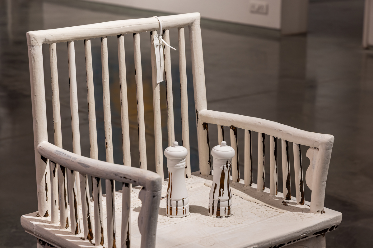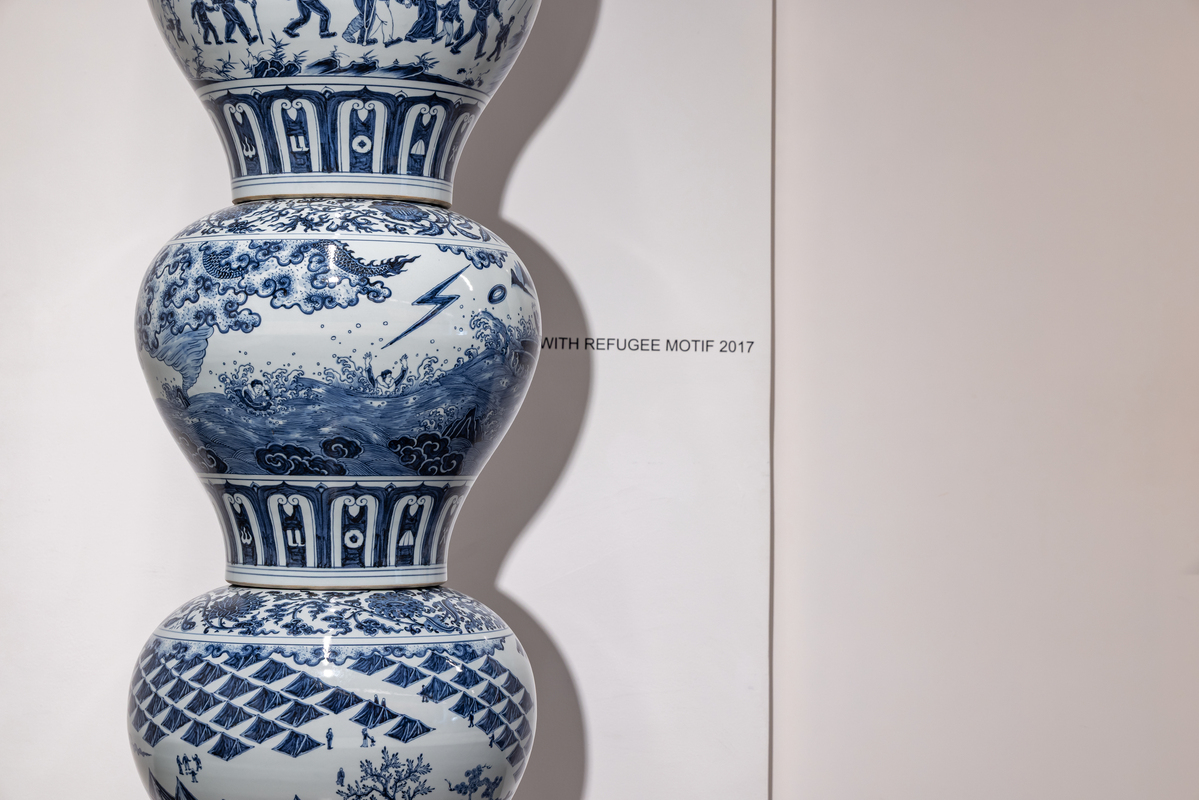 The exhibition also brings together works that move between the ancient and the contemporary: Stone Axes Painted White (with Neolithic stone axes), Porcelain Pillar with Refugee Motif (addressing migration), and new works including F.U.C.K. (made in buttons) and Whitewashed Remnants of History of the State of Emerging Future Works (shown for the first time).