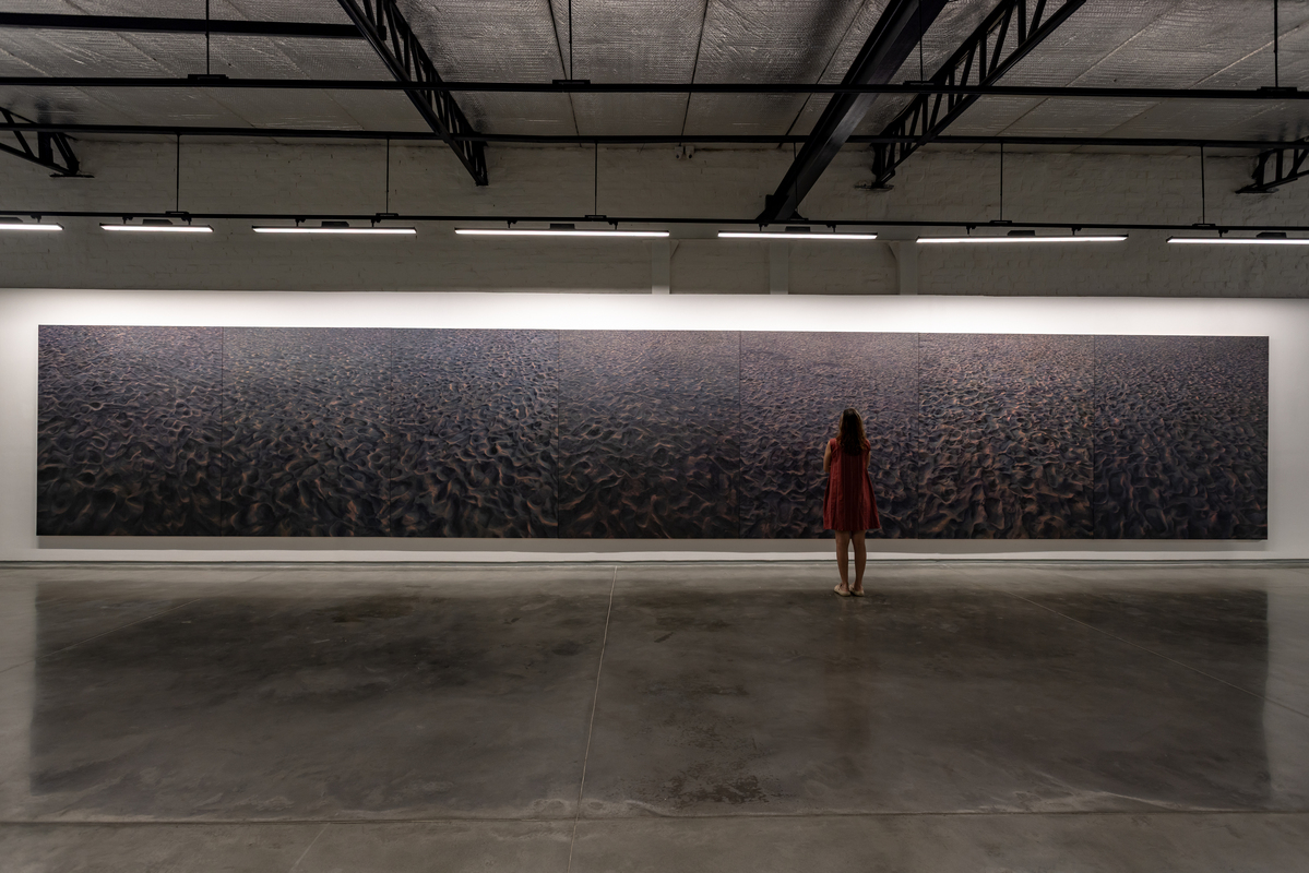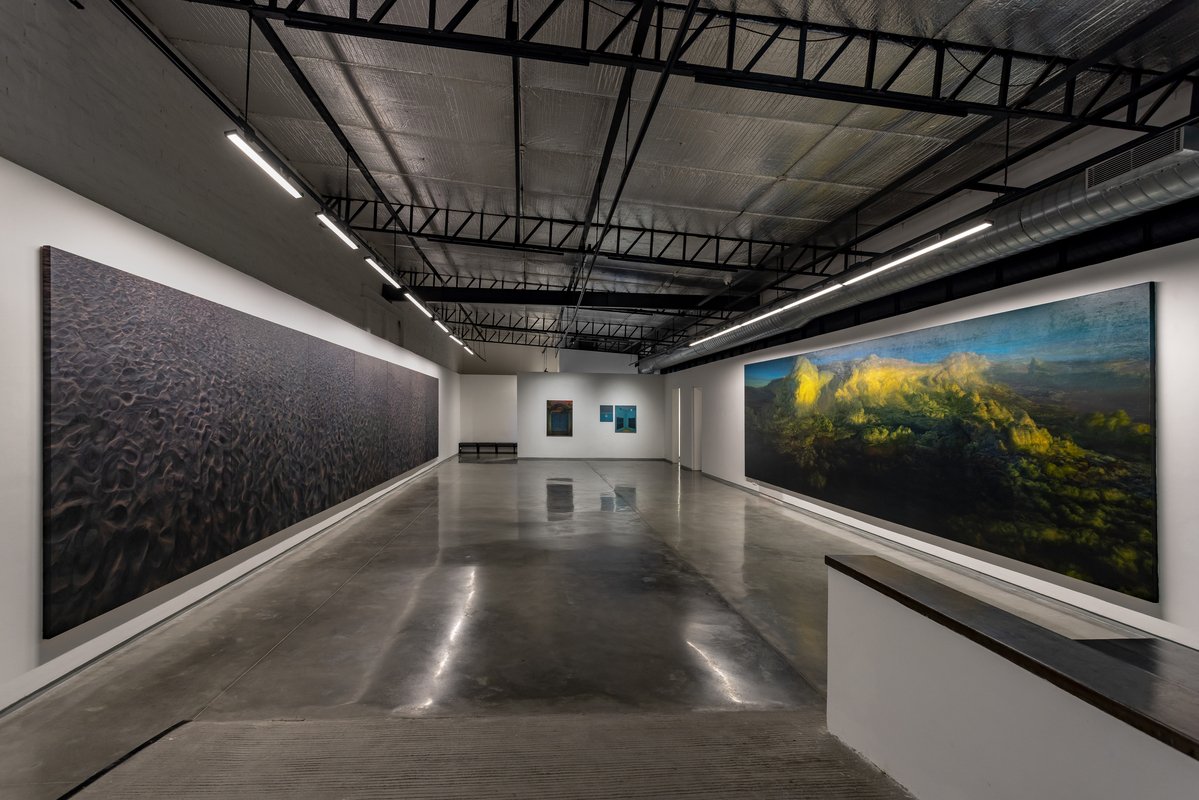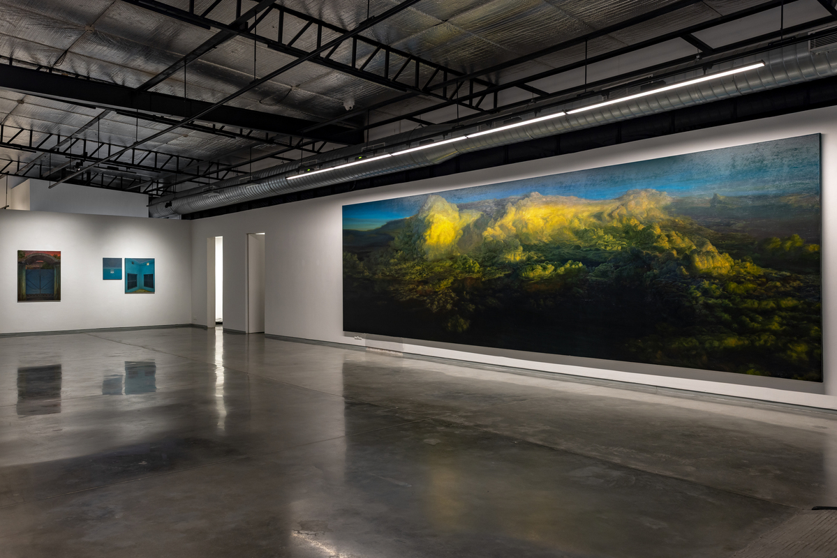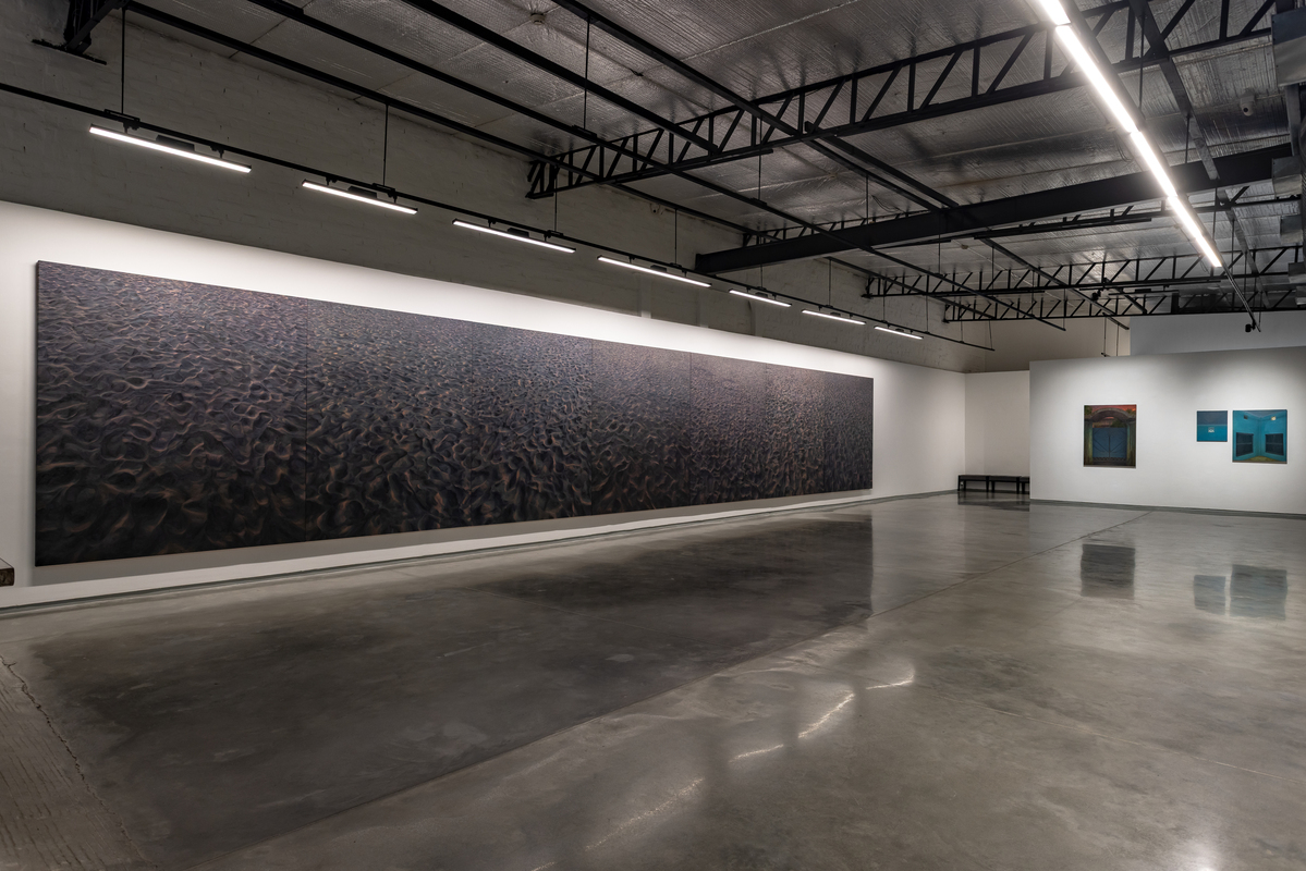 The exhibition debuts two monumental paintings: The Promised Land (oil on canvas, 8 feet high x 27 feet wide) and Ancestors (oil on canvas, 7.5 feet high x 44.5 feet wide), which extend the horizon until it becomes as much an idea as a place. In A Promised Land, a single cloud hovers like an island in an endless field of blue. Based on a view from a plane leaving New York, the image was reimagined until it felt both specific and unplaceable, a fragment suspended in the air, a form that could be arriving or dissolving. In Ancestors, undulating sand is caught in a half-light where colour and shadow mark the passing of time. One looks upward, the other down; one holds the stillness of air, the other the shifting weight of earth. Together, they frame a passage between states of being, speaking to each other in their shared scale, horizon, and sense of transience. The scale of these paintings envelopes the viewer, contradicting our now normal experience of viewing everything in the palm of our hand.