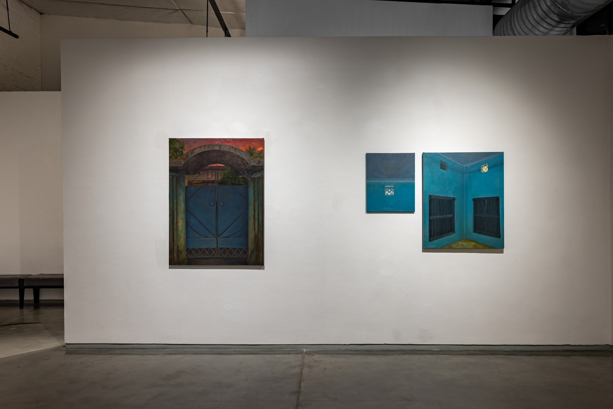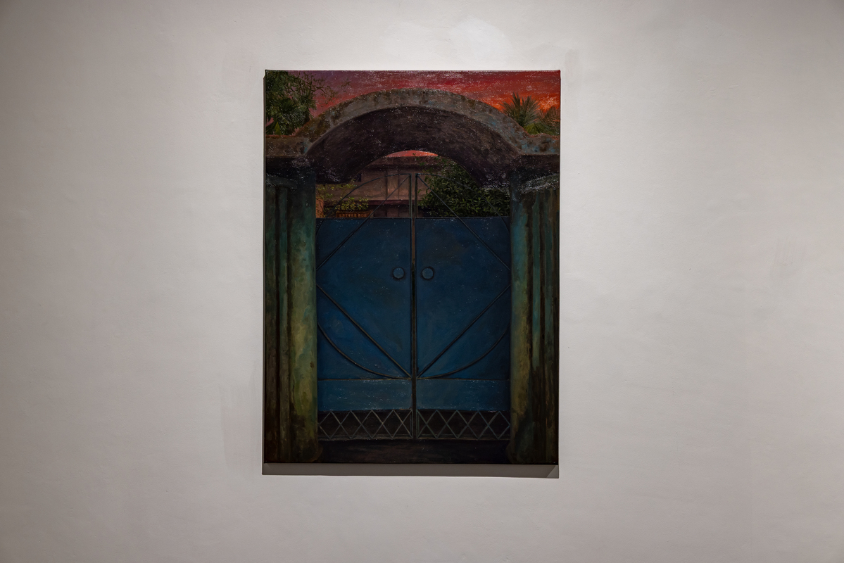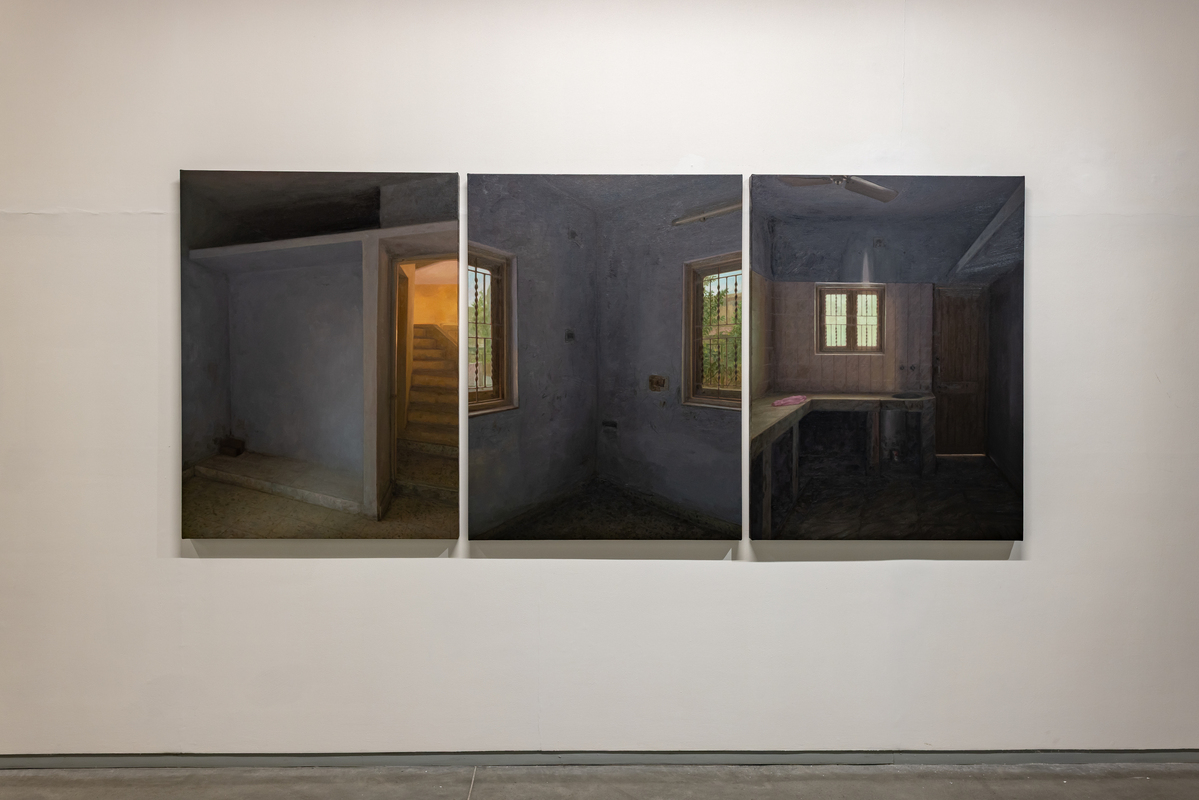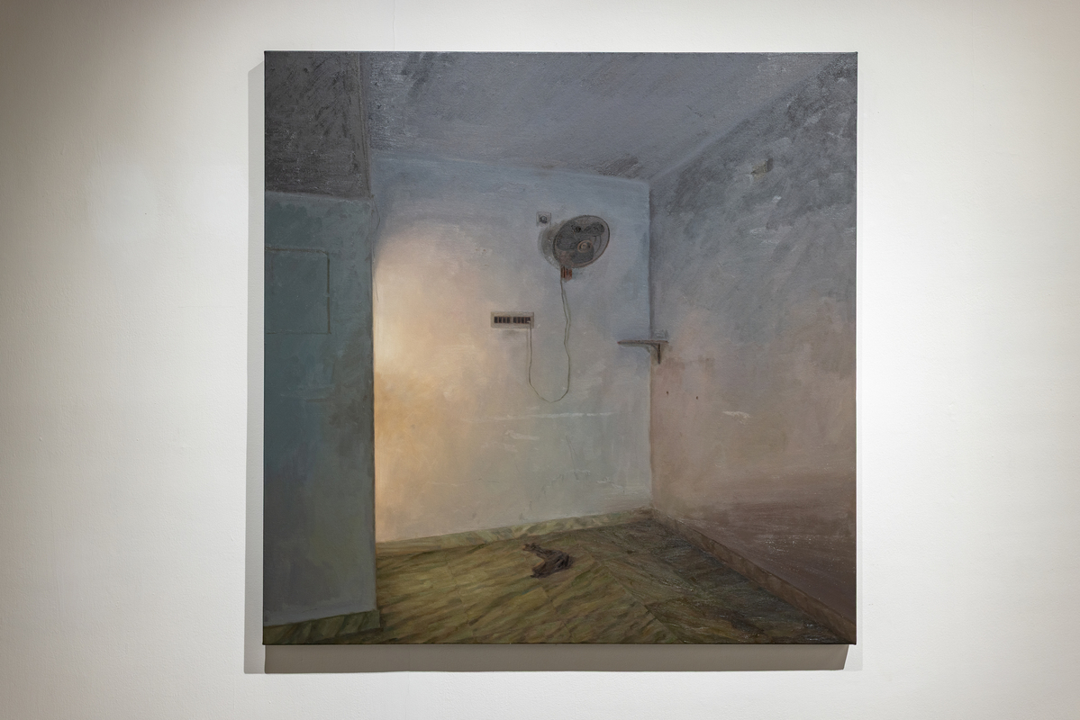 Another group of paintings bring the focus indoors. Room (oil on canvas, various dimensions) returns to the blue-walled interiors of Karmakar’s childhood home in Siliguri, painted partly from image and partly from memory so that clarity and distortion coexist. It Was Home (oil on canvas, various dimensions) depicts a rented house once inhabited by an elderly man and his daughter. Karmakar never lived there, but uses it to reflect on his own years in rented spaces that are marked by personal milestones, yet layered with the lives that came before and after. He calls it “the carcass of a memory,” evoking the dislocation of revisiting a place after time has passed.