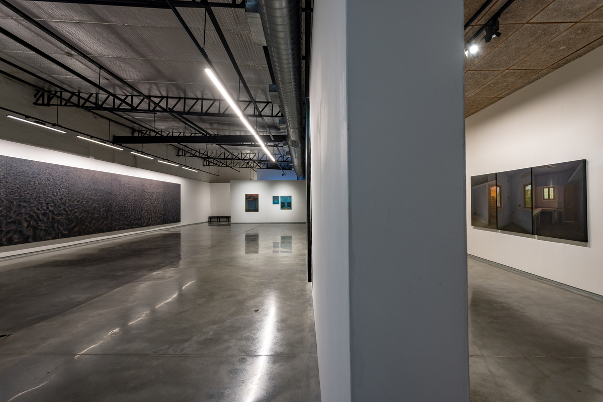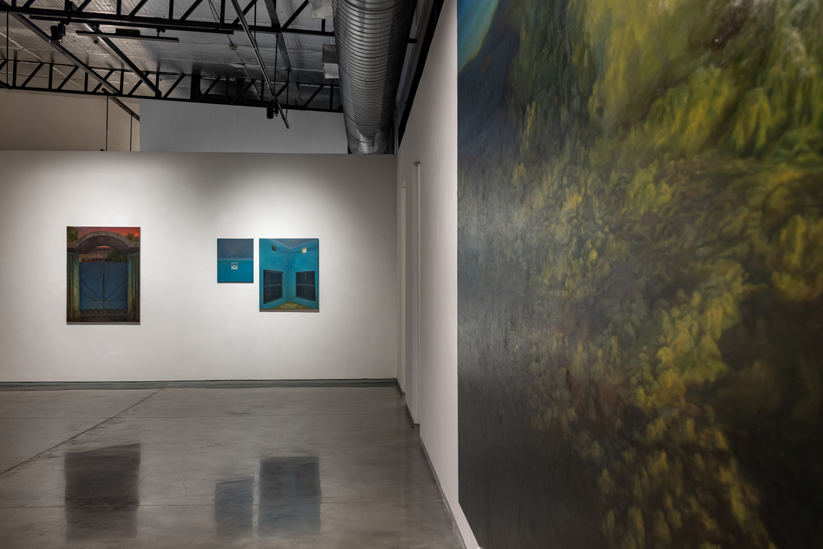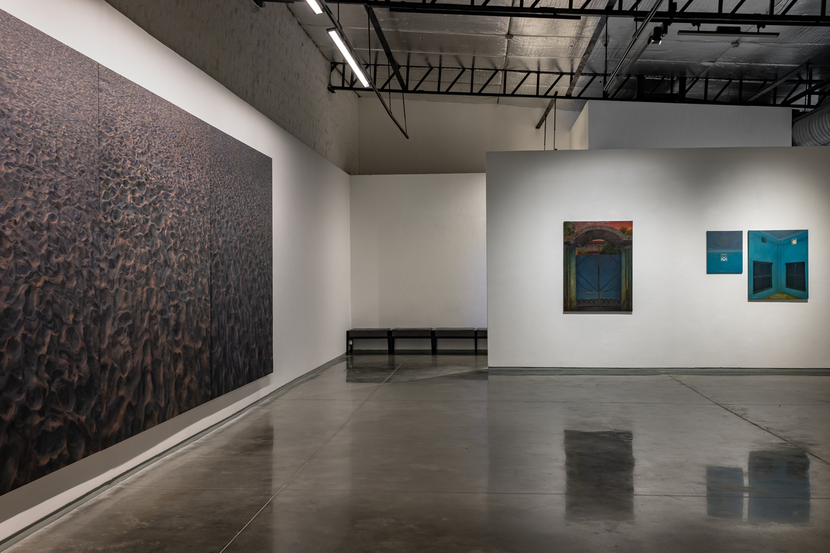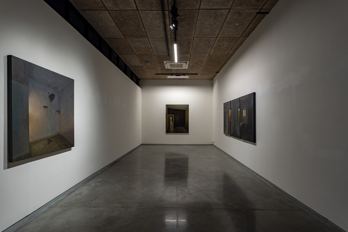 Another group of paintings bring the focus indoors. Room (oil on canvas, various dimensions) returns to the blue-walled interiors of Karmakar’s childhood home in Siliguri, painted partly from image and partly from memory so that clarity and distortion coexist. It Was Home (oil on canvas, various dimensions) depicts a rented house once inhabited by an elderly man and his daughter. Karmakar never lived there, but uses it to reflect on his own years in rented spaces that are marked by personal milestones, yet layered with the lives that came before and after. He calls it “the carcass of a memory,” evoking the dislocation of revisiting a place after time has passed.