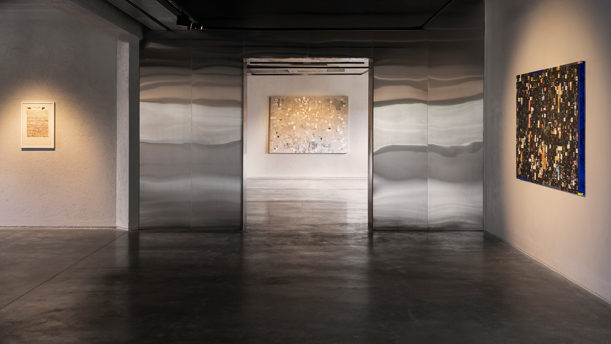 Ashes and Diamonds is a gallery presentation that includes a selection of Rai’s recent works on canvas and paper, tracing the artist’s continued engagements with both media. Among the seven larger canvas works, one may probe layers of texture and colour that flow through and create visual passages of repeating patterns, a fluid dynamic of rhythm and pull. These confident gestures give way to quieter de-centered moments—of stillness and soft movements that rest gently on the surface. The glimmer of metallic tones and the shimmer of glitter enliven the canvas, catching light in unpredictable ways and leaving one suspended between the tactile and the ethereal. With her ten paper works, there is an accessible complexity that meets a coalescing and interaction of colour and structure.