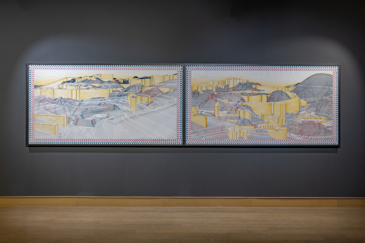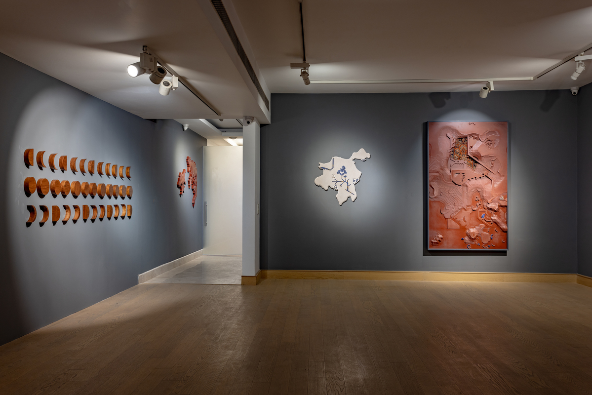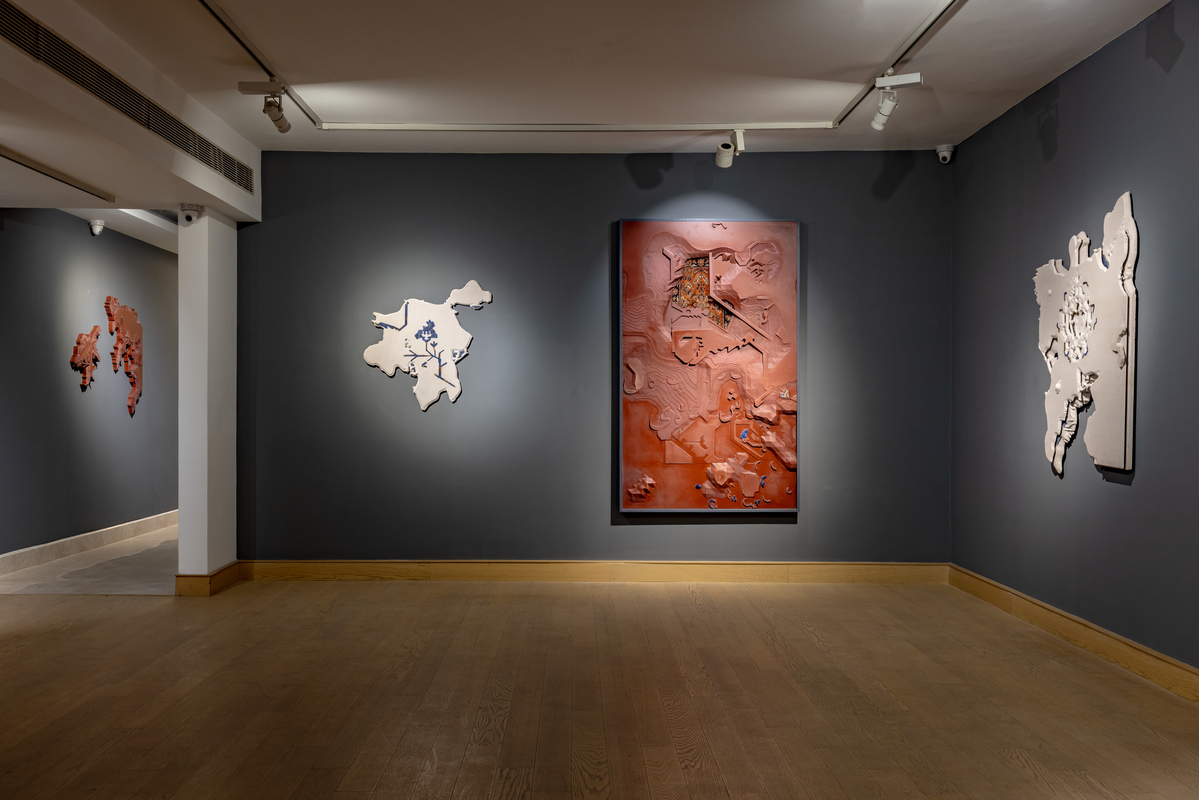 In this context, the symbols of the carpets emerge as a central medium of storytelling, which goes beyond its ornamental function to become a living map of memory. “Growing up, I always saw Persian and Afghani carpets in my grandmother’s home. I would lose myself in their complex, maze-like patterns. It was like a cityscape, where each shape held its own significance,” she says. She juxtaposes the patterns of these carpets on to maps from her memory of the cities she has lived in to create sculptures of landscapes that function as evolving sites where memory is continually reworked and re-imagined. It is as much a process of abstraction as it is of reconstruction.