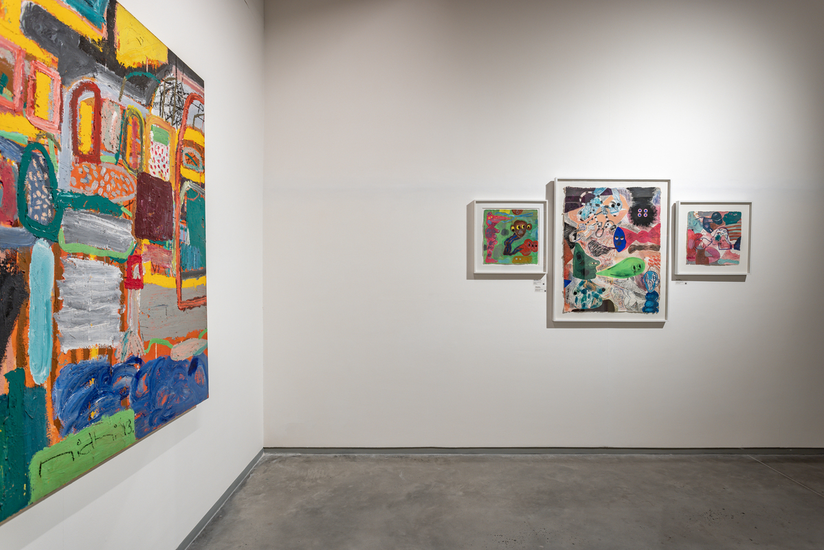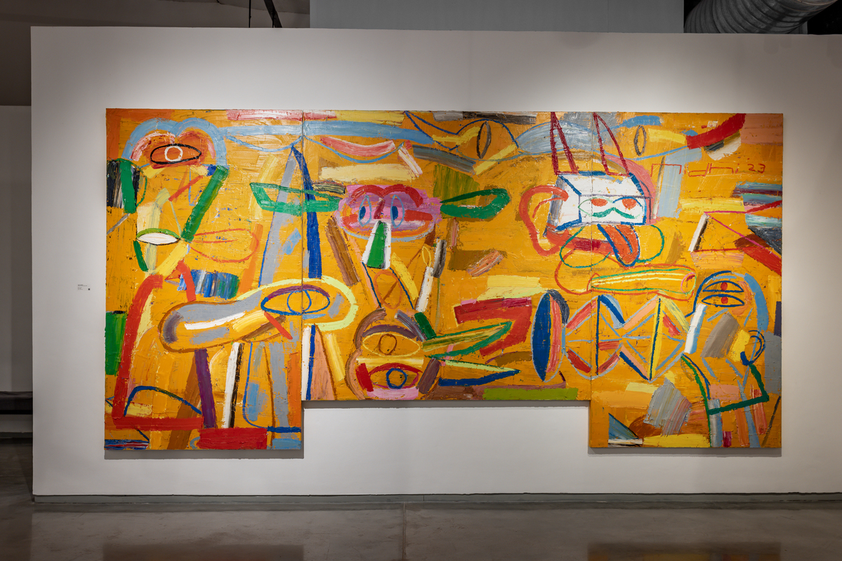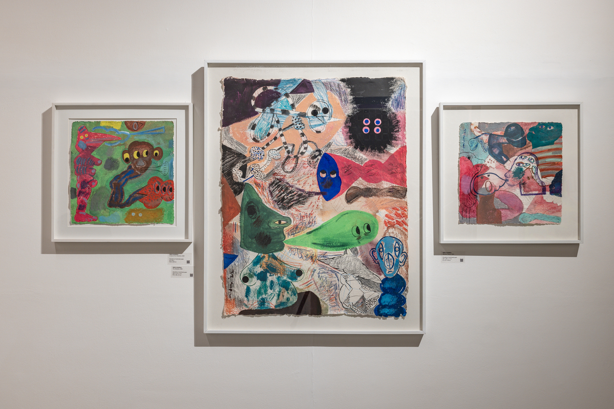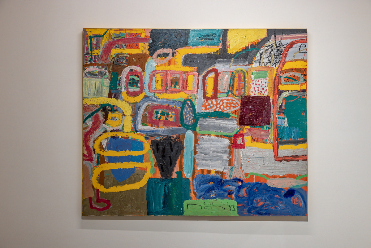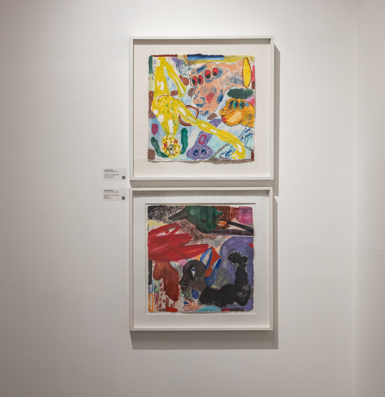 Known for her aggressive and hyper-chromatic paintings, Agarwal’s works veer away from pure abstraction to explore figuration, caricature, calligraphy, and vocabulary. What may at first appear to be purely chaos quickly becomes legible and the artist’s choices and control are evident. Agarwal’s canvases are large, imparting a physical, almost performative, sense to the works and as the artist is small in stature, it seems she must wrestle with the images they contain. Faces and figures appear and then fade away in a ballet in which no single element commands the center of attention. Her paint is thick and viscous, her colors often discordant, her linework a dangerous trap to become ensnared. This is painting which juggles pleasure with pain, beauty with horror. Agarwal continues to live and work in Delhi.