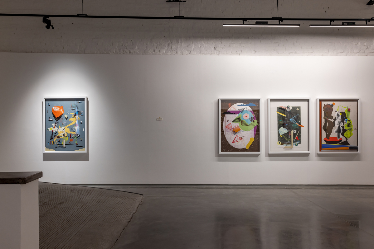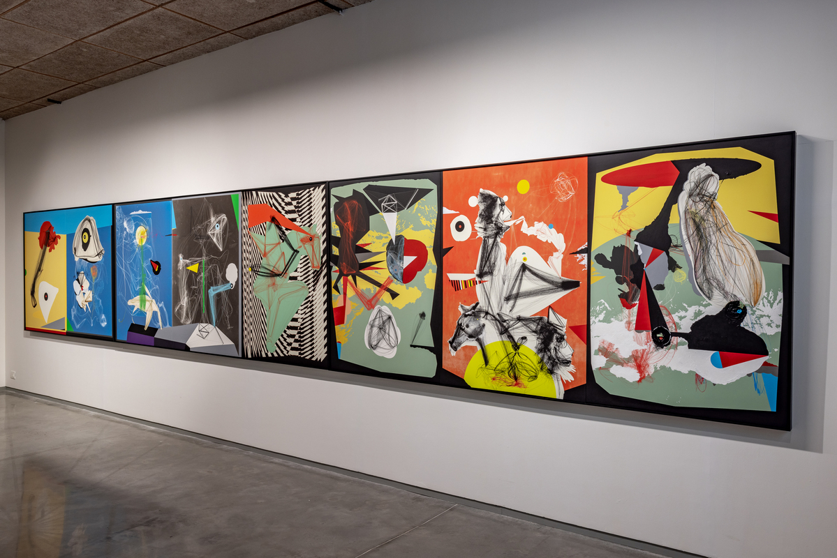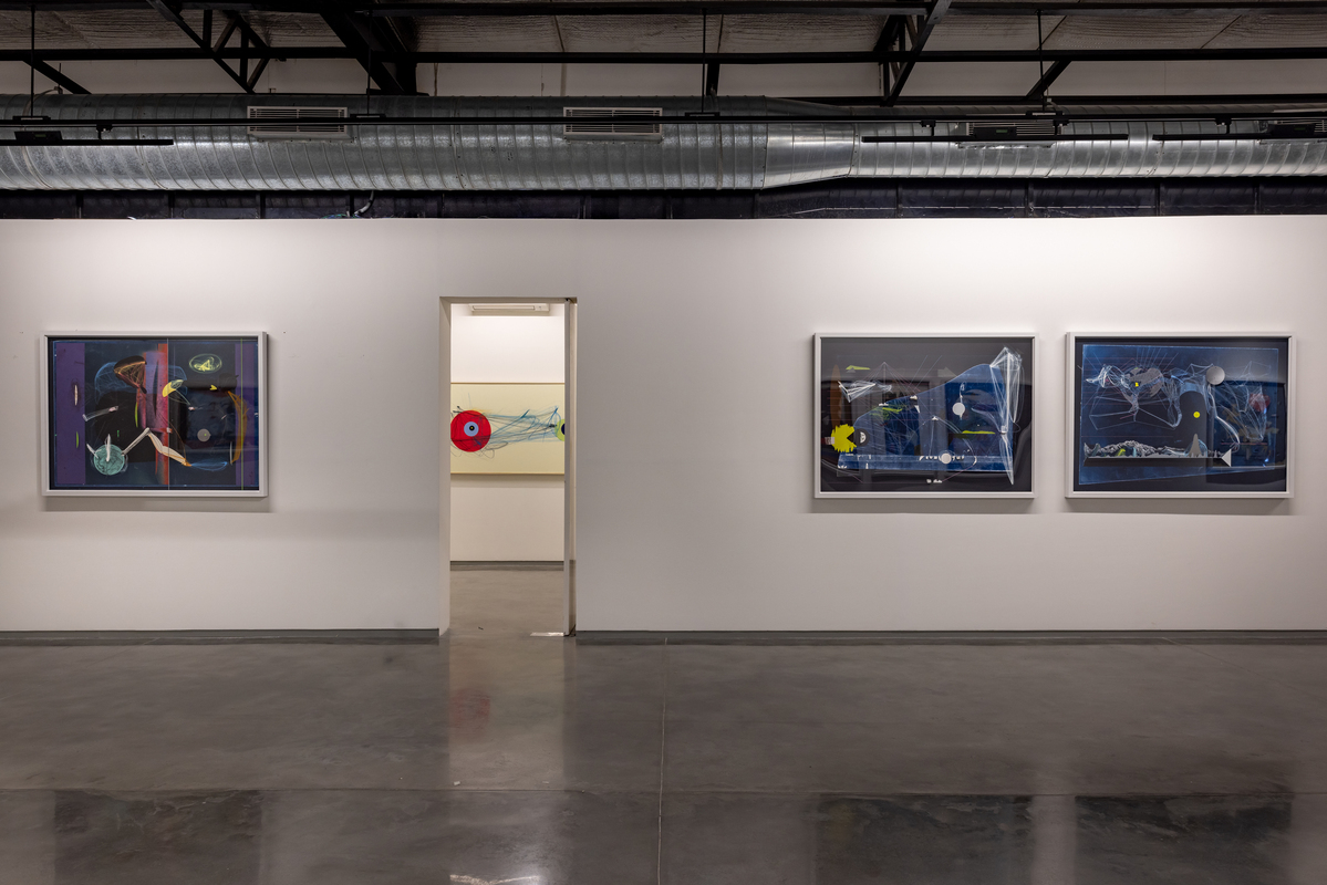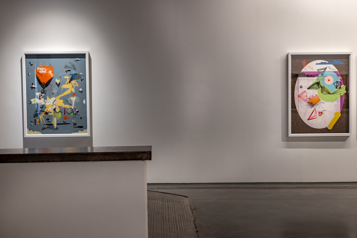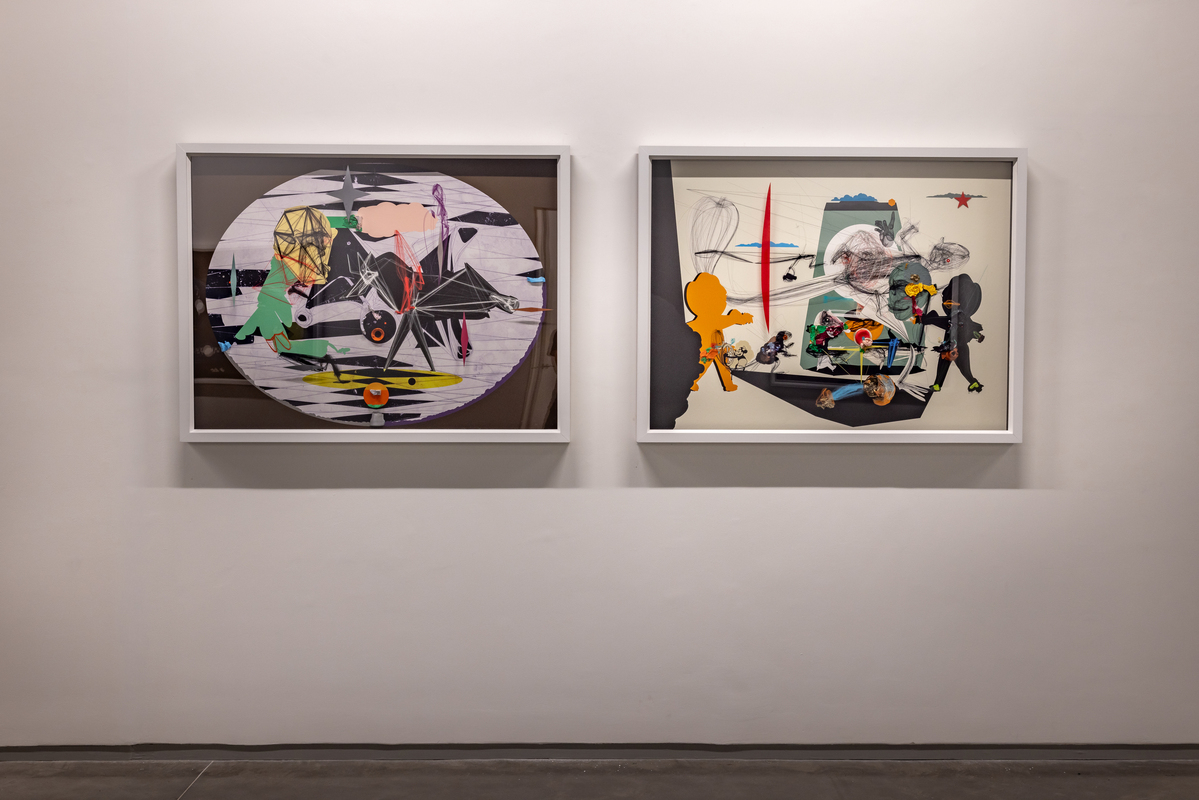 Pande's process is rooted in drawing and the extension of line and form through various media. The artist’s technique involves constructing complex vector images digitally, then printing and then adding layers of paint, hand-applied marks and attached objects and materials. The end results are hybrids which combine drawing, painting, and collage. His stylistic oeuvre involves the integration of subject and object until one enfolds the other and both are lost in a kaleidoscope of chaotic multiplicity. They present a view that is untethered, floating somewhere between prehistoric cave paintings and speculative fantasies.