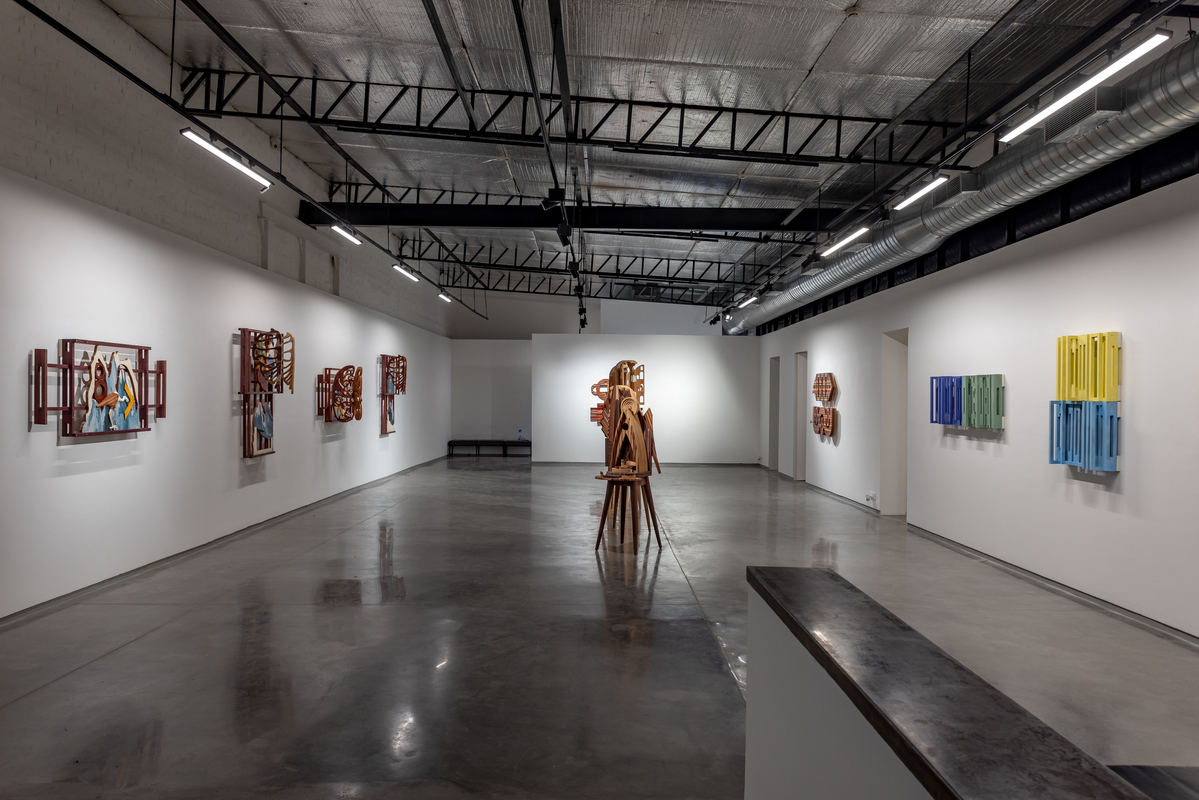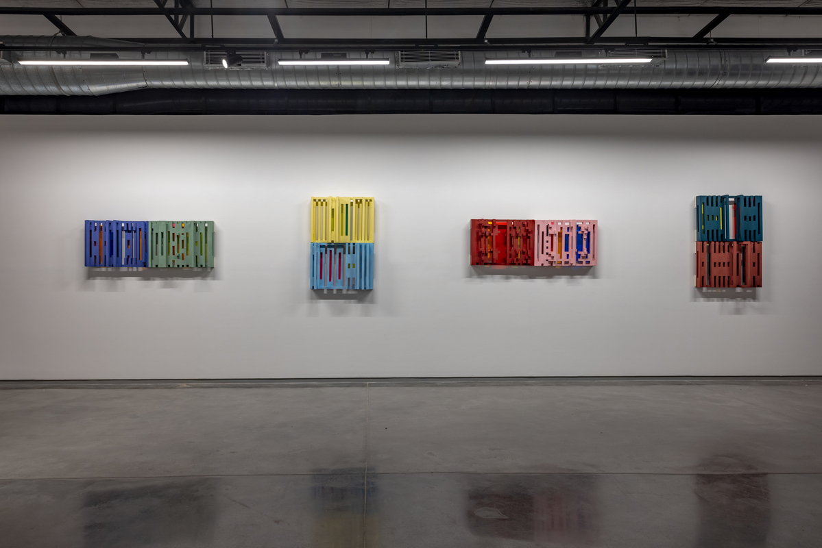 Another series of works, entitled “Study of Daylight in Phases,” consists of rectilinear lattices in different configurations, each in a pair of complementary colors, their structures diffused by the play of shadows across their surfaces along with backdrops of colored acrylic sheets. “Fictional Symphony Halls” is the title of a group of architectonic models that are propped up on stilt-like legs. Complex and kinetic, each is its own folly, suggesting a theater or a temple, a spaceship or a birdhouse. A final untitled series is of four works that resemble unfolding frames, or perhaps windows or the easels for paintings. These complex shapes contain cryptic pictograms: birds, mountains, lungs, yardsticks, and a sprinkling of eyes.