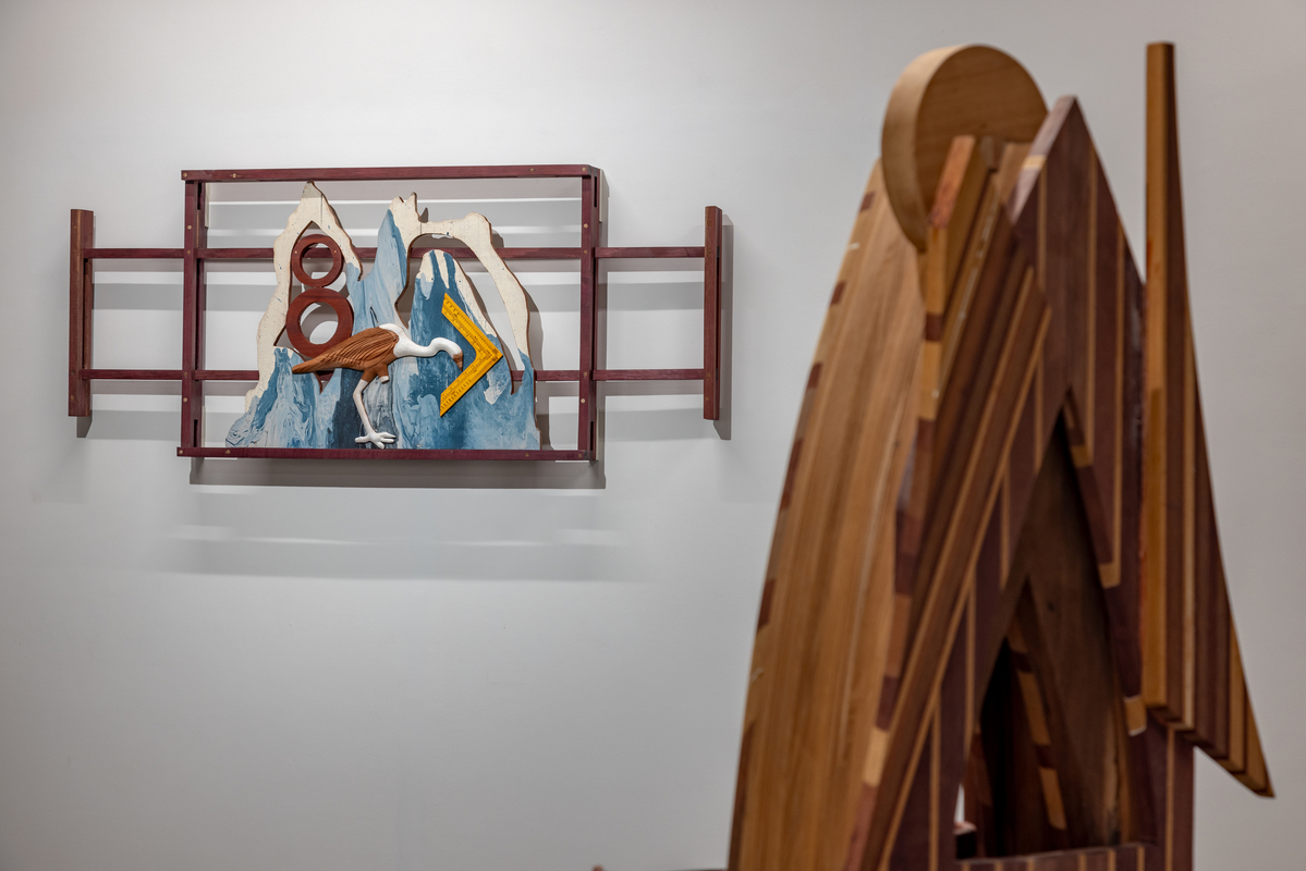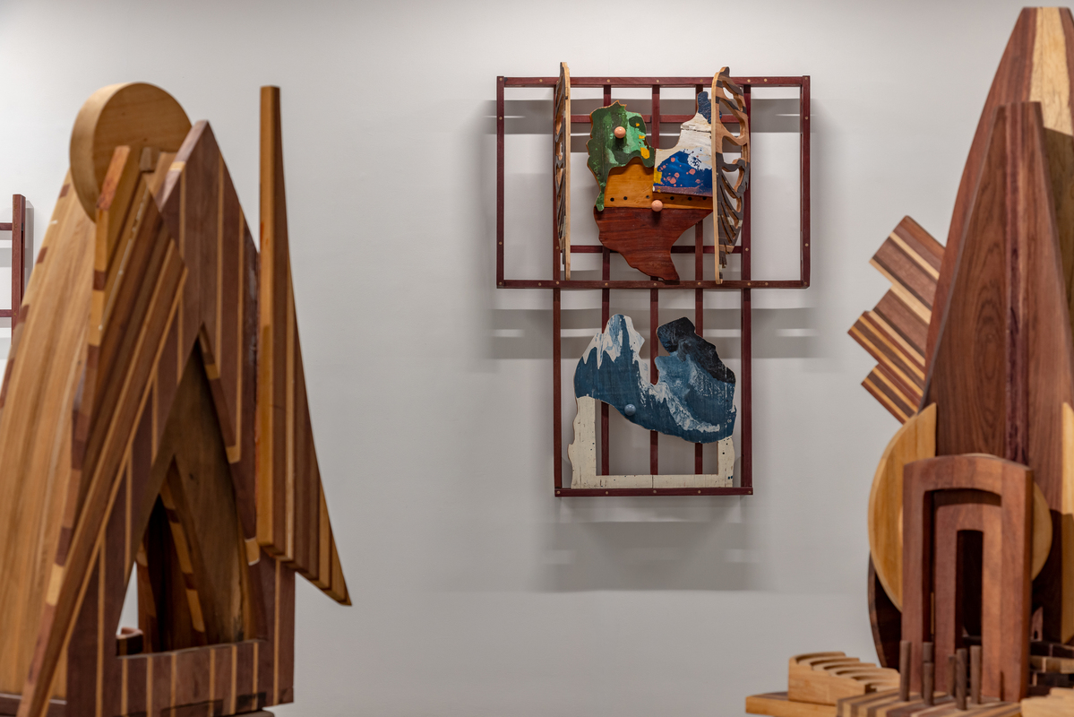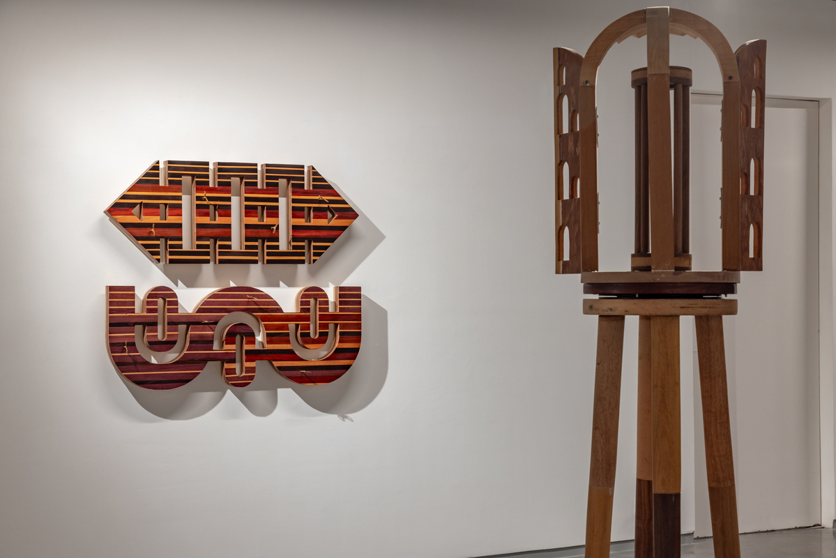 The exhibition is composed of multiple series of works, composed mostly of wood with other added materials. One series, entitled “Study of Jogger’s Lanes,” is both interactive and musical. Exploiting the variegated colors of different types of wood, these are fused together using precise marquetry techniques, becoming complex hieroglyphics. These structures disguise the simple mechanisms of old-fashioned music boxes, with multiples inside of each piece. The keys to the music boxes are scattered across the face of the construction, allowing the viewer to activate one or all of the devices. The aural result can be a soothing nostalgic lilt or something akin to the sounds of a madhouse.