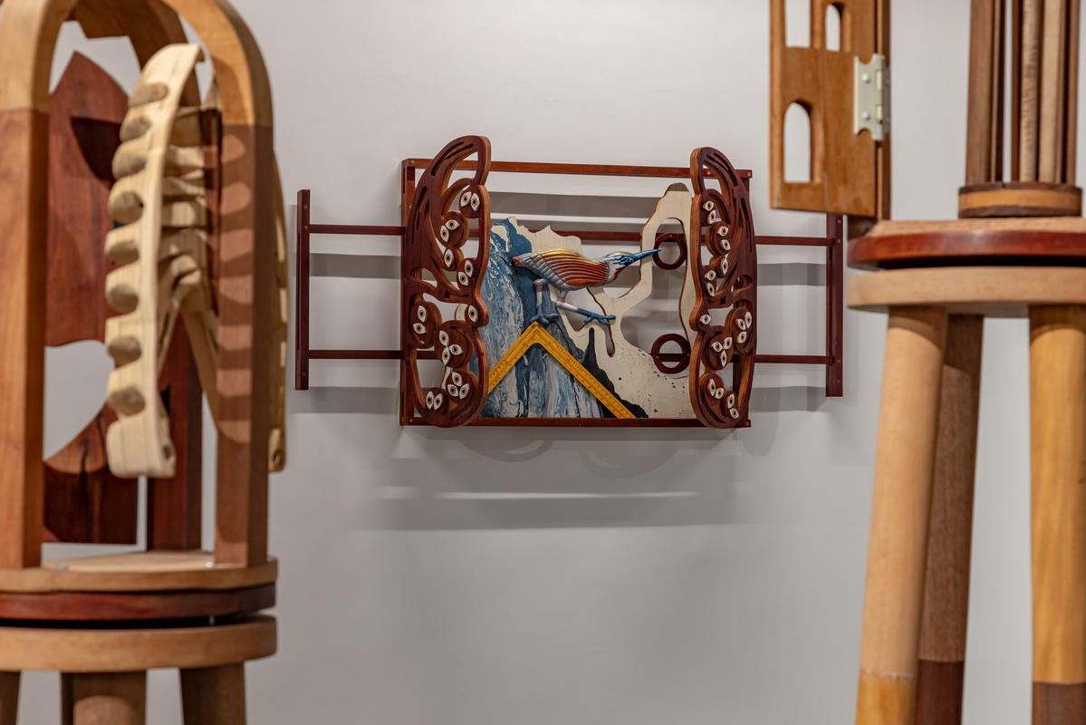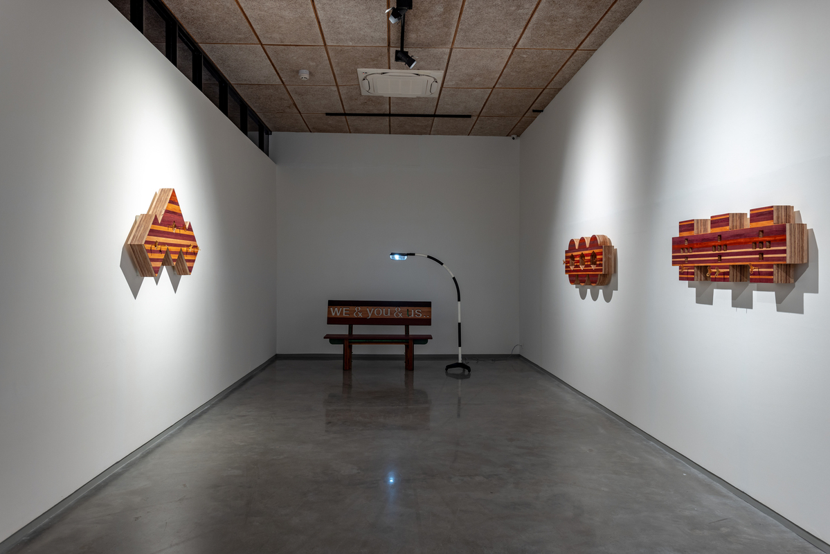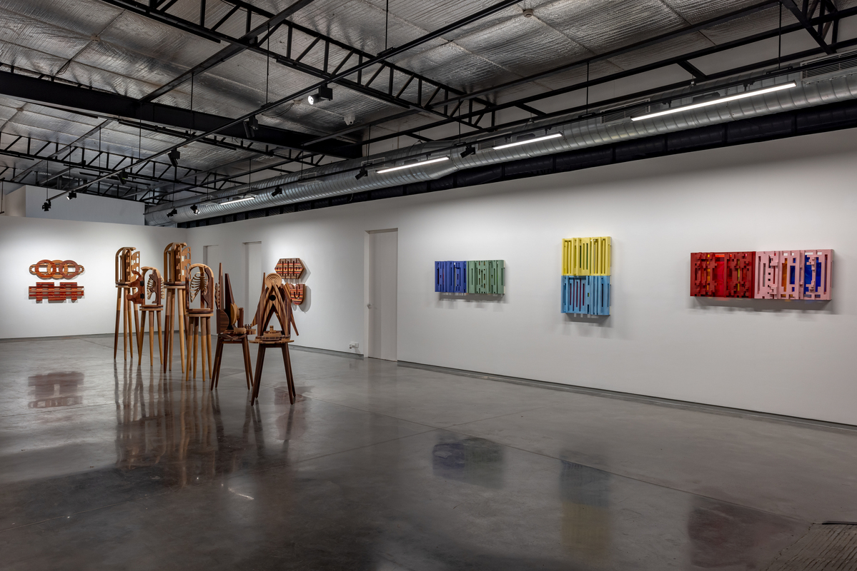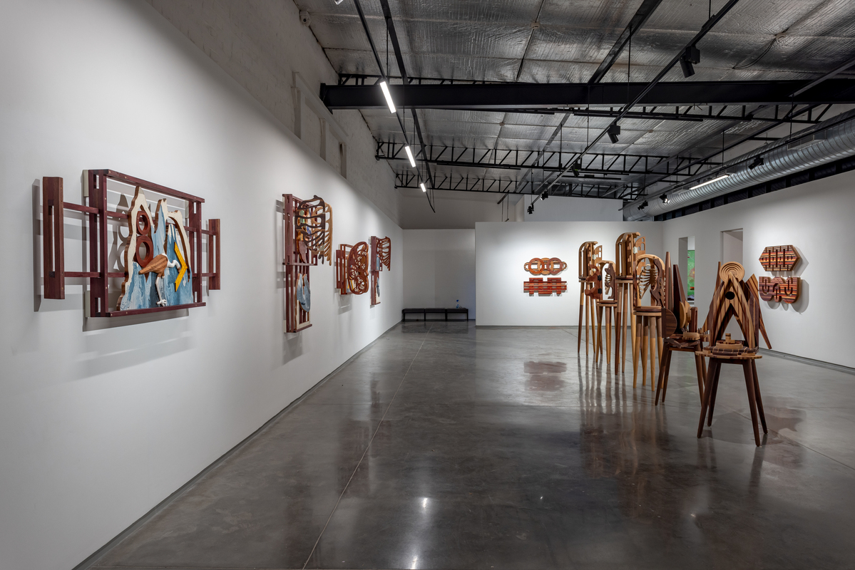 The exhibition is composed of multiple series of works, composed mostly of wood with other added materials. One series, entitled “Study of Jogger’s Lanes,” is both interactive and musical. Exploiting the variegated colors of different types of wood, these are fused together using precise marquetry techniques, becoming complex hieroglyphics. These structures disguise the simple mechanisms of old-fashioned music boxes, with multiples inside of each piece. The keys to the music boxes are scattered across the face of the construction, allowing the viewer to activate one or all of the devices. The aural result can be a soothing nostalgic lilt or something akin to the sounds of a madhouse.