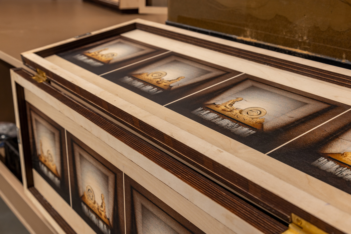 In the side gallery there is a three-part work entitled Deep Learning PI (Portable Intelligence). In the form of shelves with drawers and storage, Tallur catalogues the works that he has exhibited with Nature Morte in the course of our twenty-year relationship. In this work, Tallur tries to teach the artificial neural networks to mimic his own works and handholds an AI toddler to grow up in the right direction. AI creates its own miniaturised versions based on Tallur's previous works. The work comments on the narcissistic attributes of the obsession with archives but also the commodification of art works through their reproduction.