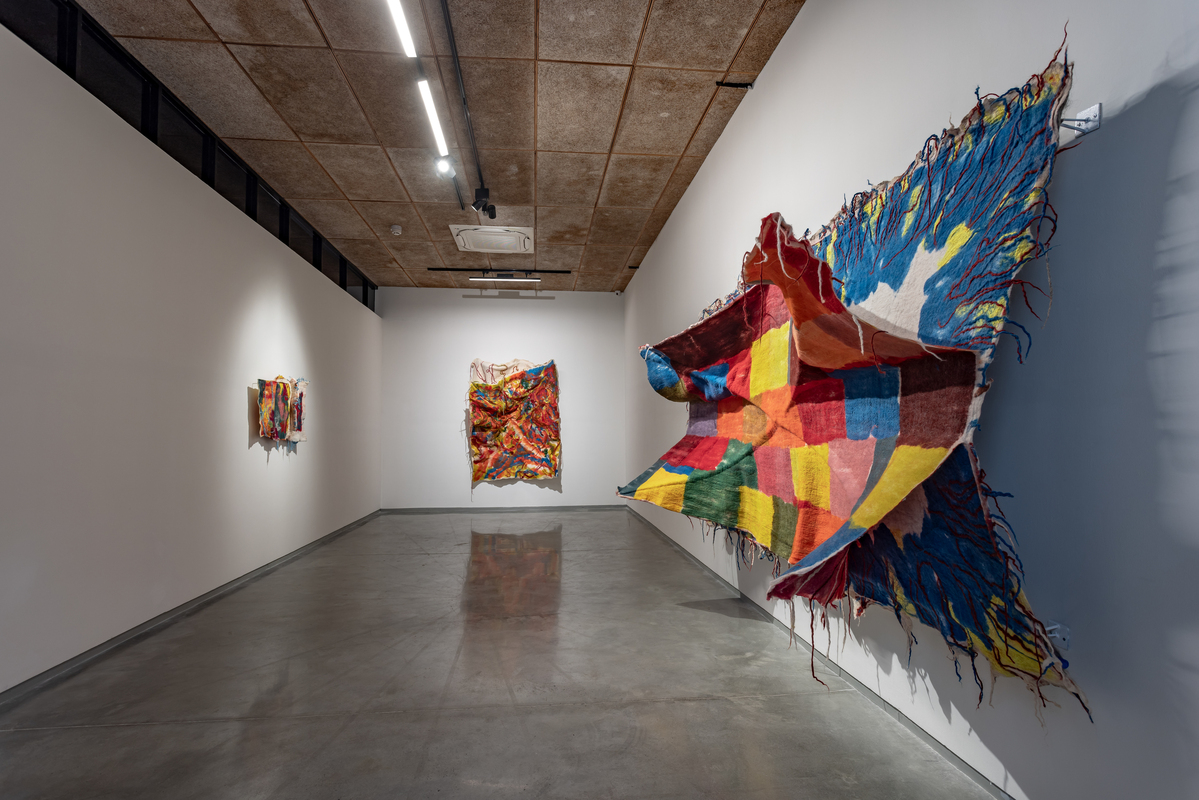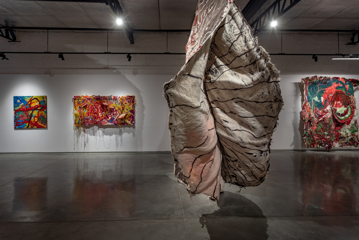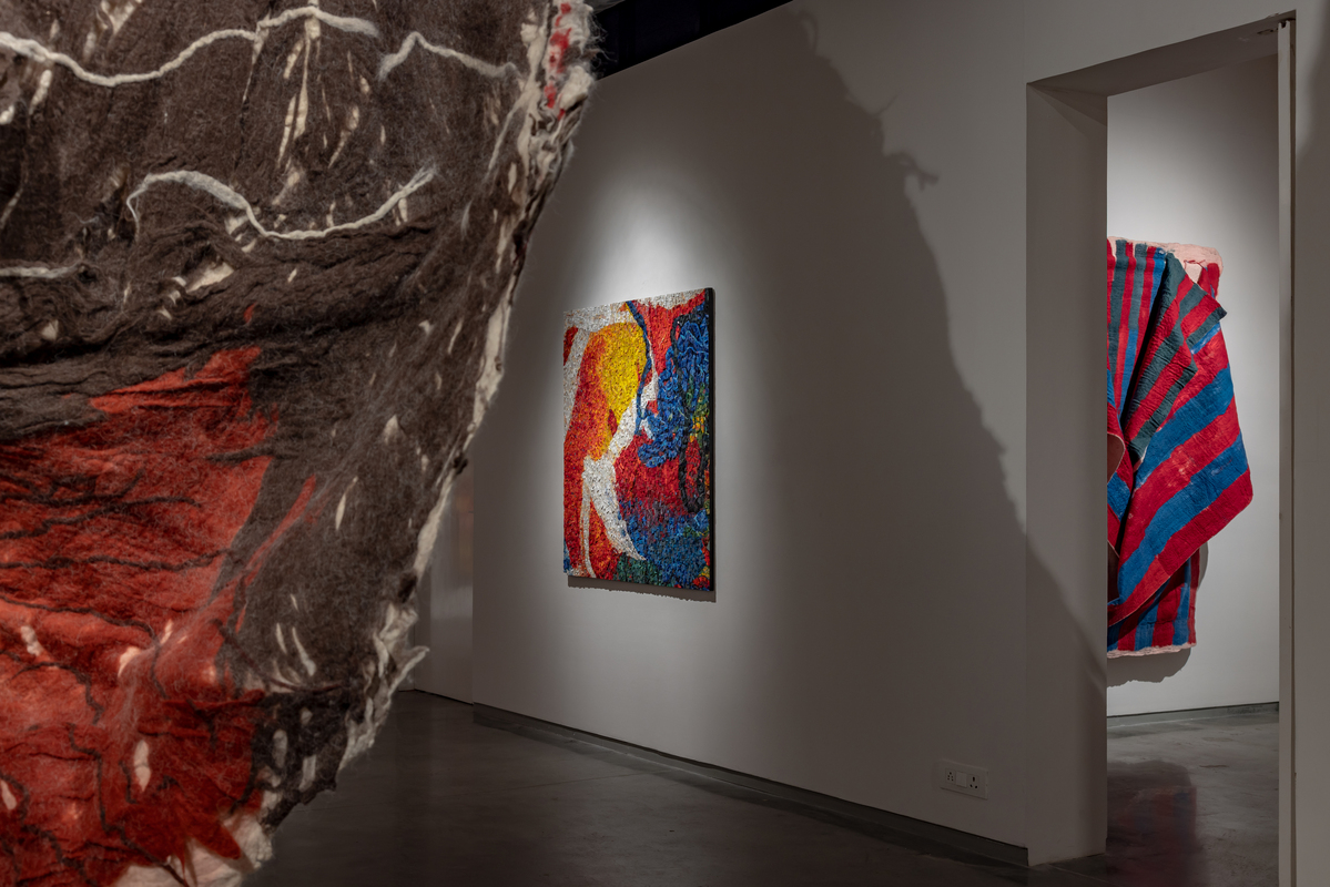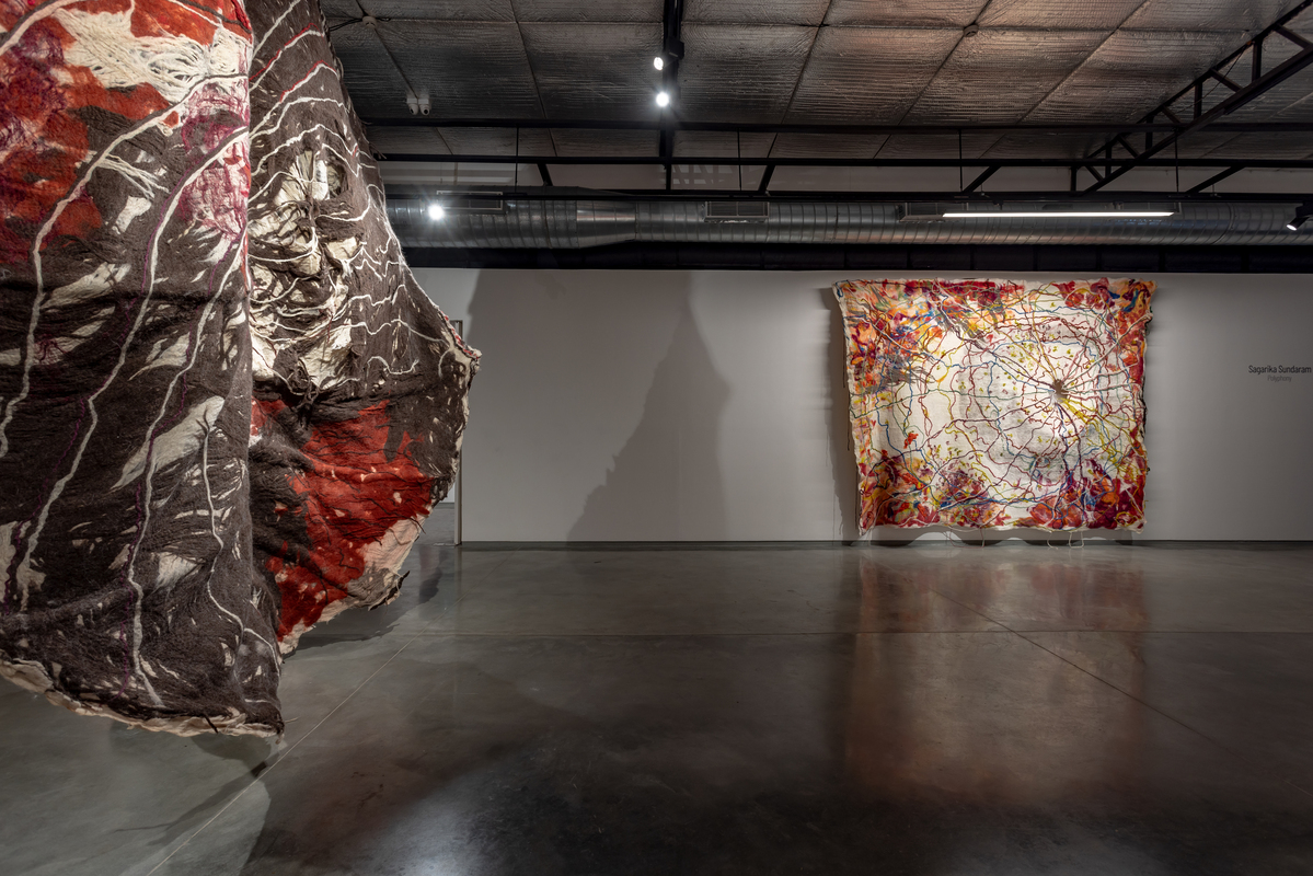 While she works with a range of textiles, Sagarika's primary material is felt, which she makes by hand and dyes herself. The dynamic process, during which rolls of raw wool fiber are transformed into monumental sculptures in the hands of the artist, is almost theatrical. After laying the raw material on the ground in the form of a wooly, mesh-like membrane, she uses soap and water to transform it into a single piece of material, building the layers from the backside. The face of the work reveals itself only when she flips it over and she then cuts open the piece to reveal the layers within. Sagarika executes this with surgical precision to expose the unknown and unexpected that result from her labour-intensive process.