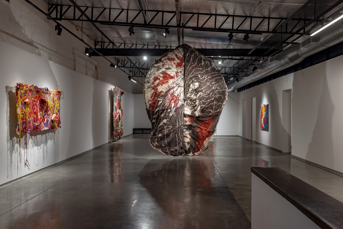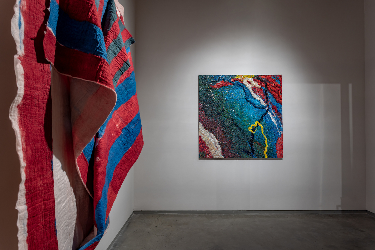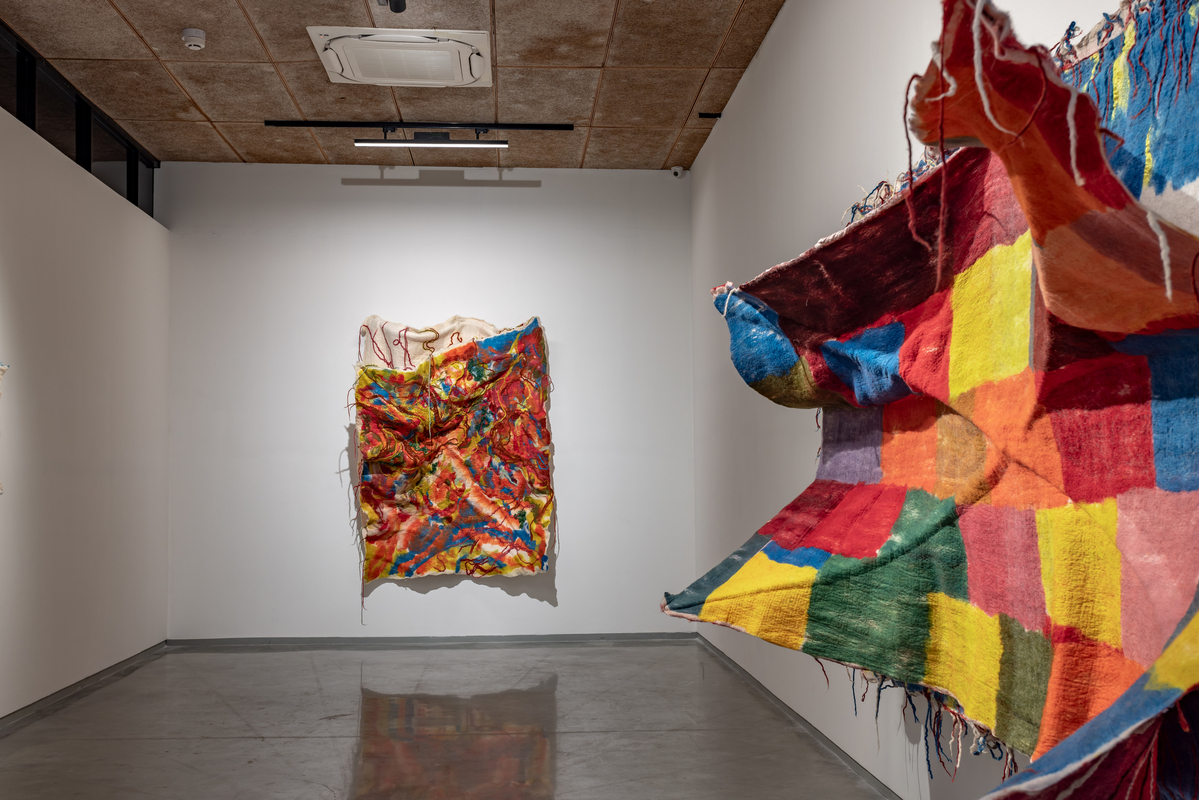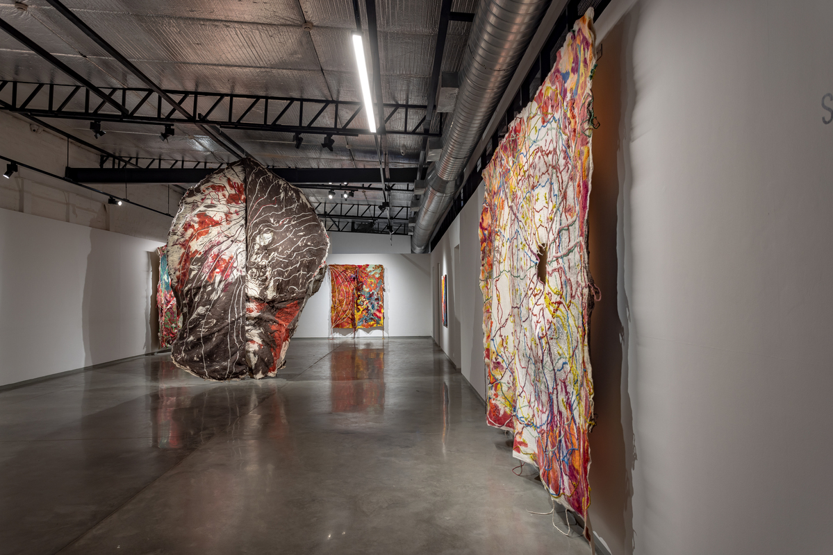 While she works with a range of textiles, Sagarika's primary material is felt, which she makes by hand and dyes herself. The dynamic process, during which rolls of raw wool fiber are transformed into monumental sculptures in the hands of the artist, is almost theatrical. After laying the raw material on the ground in the form of a wooly, mesh-like membrane, she uses soap and water to transform it into a single piece of material, building the layers from the backside. The face of the work reveals itself only when she flips it over and she then cuts open the piece to reveal the layers within. Sagarika executes this with surgical precision to expose the unknown and unexpected that result from her labour-intensive process.