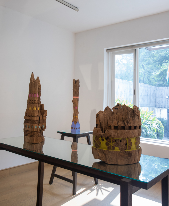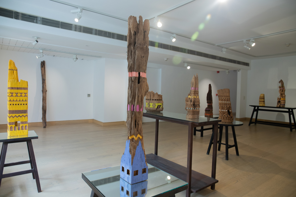 We usually associate “found objects” used in sculptural practice as relating to consumer goods or some sort of industrial detritus. Gowda’s “found objects” are sourced from the jungles around the university where he lives and works in Navi, Mumbai. Chunks of wood have been eroded by weather and disfigured by insects, bearing little resemblance to their initial living forms. We are unsure how much the artist has altered these found elements but we can be certain that the bands of patterning which encircle them, both carved and painted, are surely man-made. As stationary objects they defy a sense of scale: perhaps being proposals for monumental projects, perhaps propositions for household appliances.