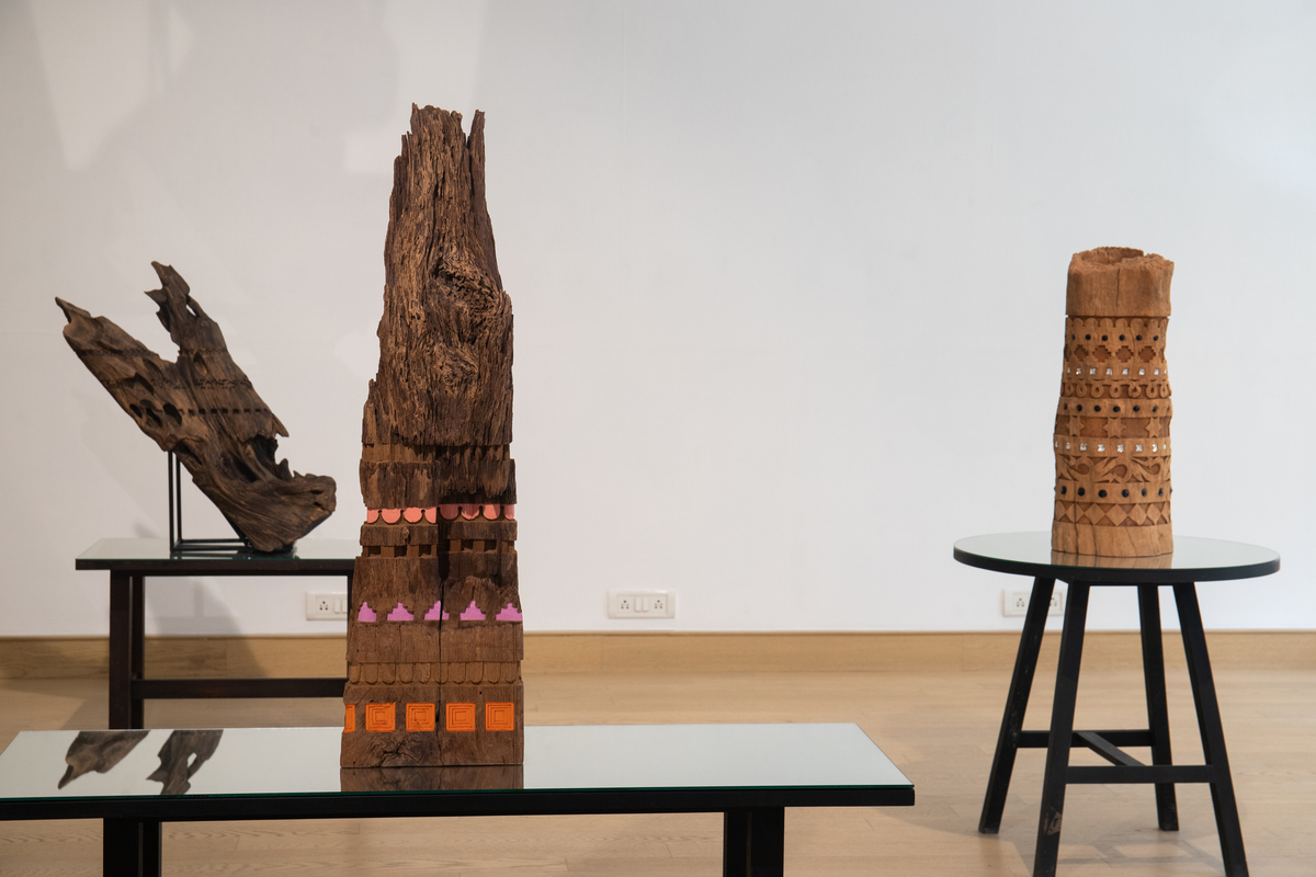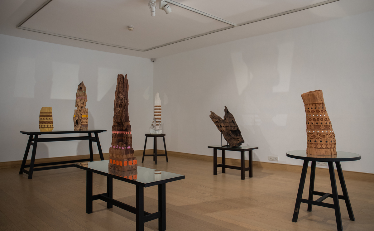 “This body of work draws inspiration from the architectural grammar of temples and monasteries of Ladakh and its terrain, where endurance and erosion coexist in fragile balance. The circular carvings on these wooden sculptures echo the circumambulating figures of pradakṣiṇā, where verticals and horizontals intersect to generate rhythm, geometry, and vitality. This principle also resonates with quantum mechanics, where rotation is fundamental to the identity of matter. Much like electrons orbiting a nucleus or intrinsic spin shaping a structure, these works affirm that at every scale, be it cosmic, human or quantum, rotation is the language of order, energy, and renewal.