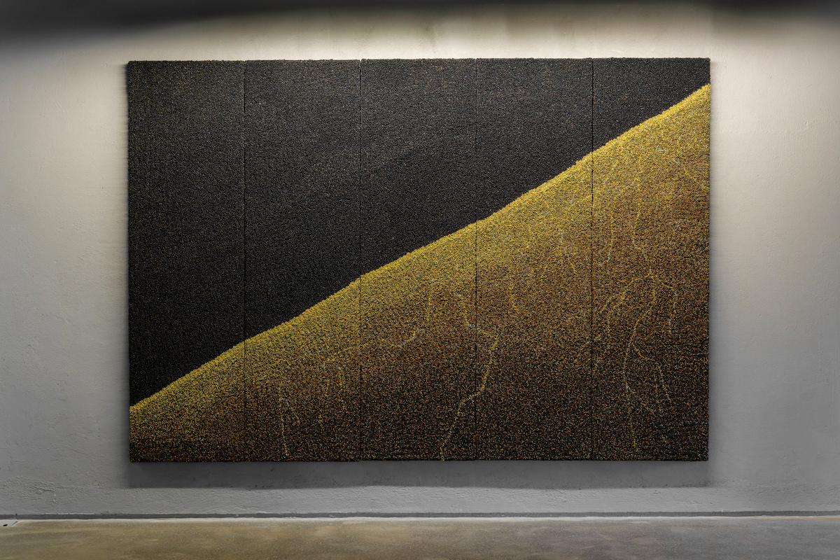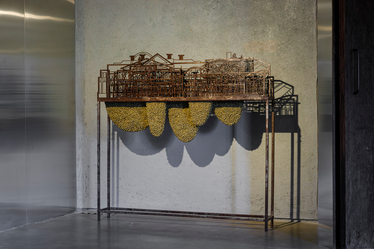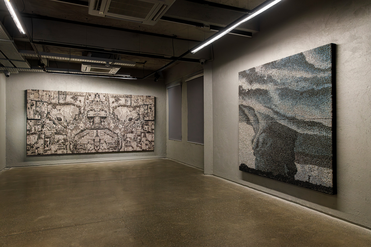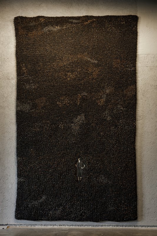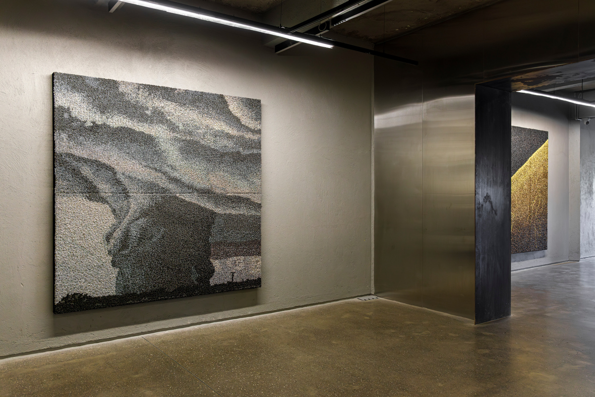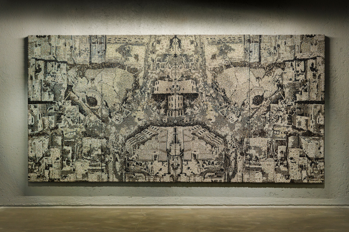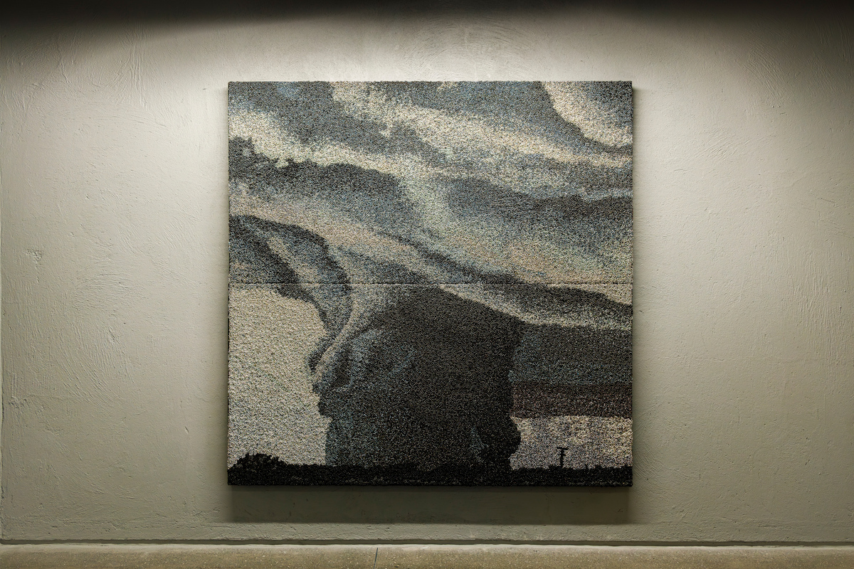 The works on view are in a variety of materials. Four works are in the artist’s signature medium of patinated ghungroos, the tiny metal bells woven together to create tapestry-like images. On view will be four new works, each of a very different character: “I Don’t Know,” “Temper,” “Fire in the Sky,” and “Fractured.” Each of these works responds to the general theme of the exhibition in different ways. While some picture destructive forces and a foreboding anxiety, others offer a sense of hope and redemption from what seems inevitable.