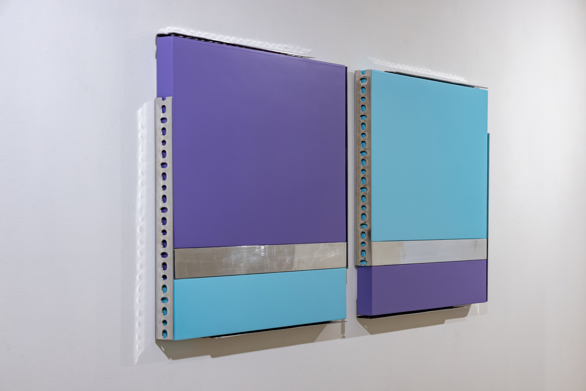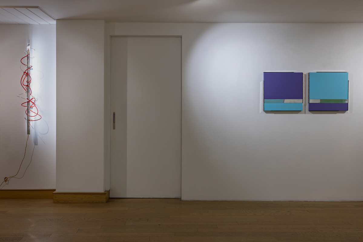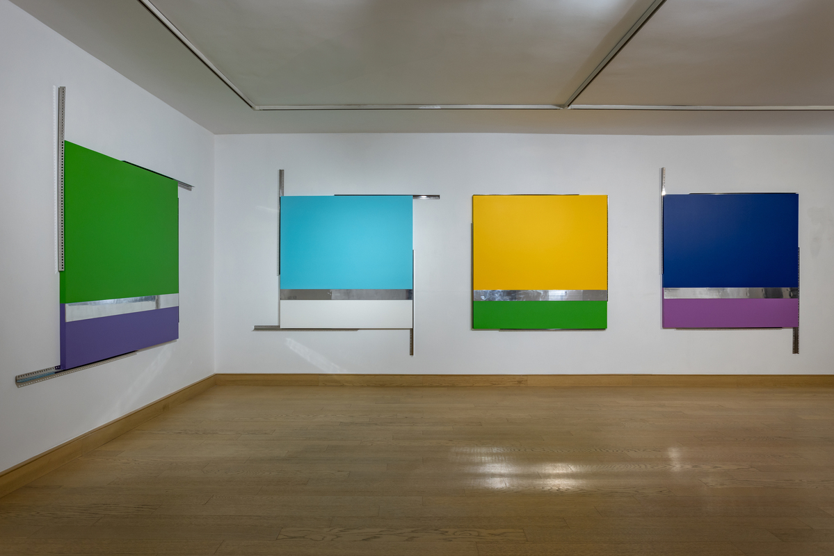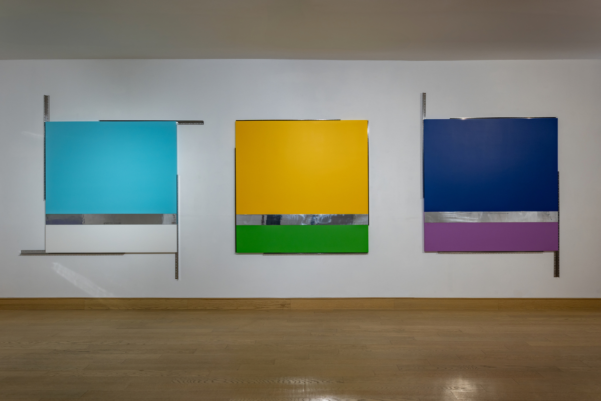 The majority of the exhibition are what the artist refers to as his “House Paintings.” These replicate, in both materials and design, the walls of homes found in rural Maharashtra. Aggressive in their simplicity, each painting consists of two solid colors divided by a band of aluminum. An unlikely bridge is created between a history of minimal art in the Western World and the innocent expressions of the vernacular Indian populace.