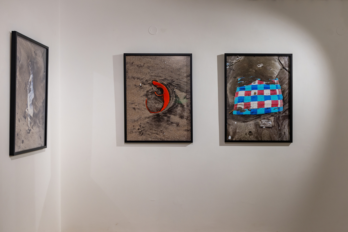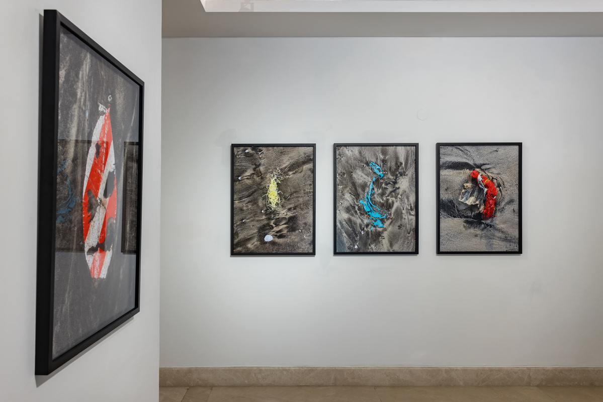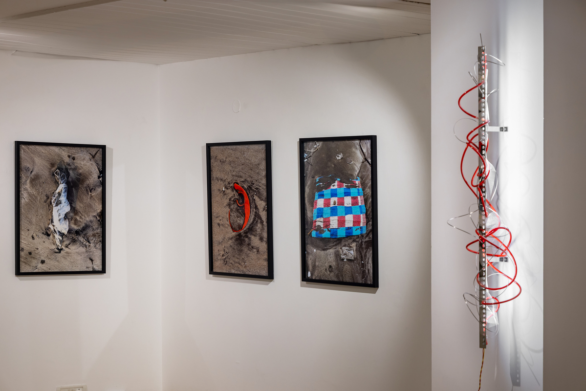 A new series of photographic works are also included in the exhibition. These portray debris partially buried in the wet sand of the Maharashtra coast. While both elegant and macabre, they speak of environmental degradation but also nature’s strength to resist man’s blunders. Completing the exhibition are two sculptures that resemble rockets or lighting fixtures, electrified amalgamations of technical flotsam and jetsam.
