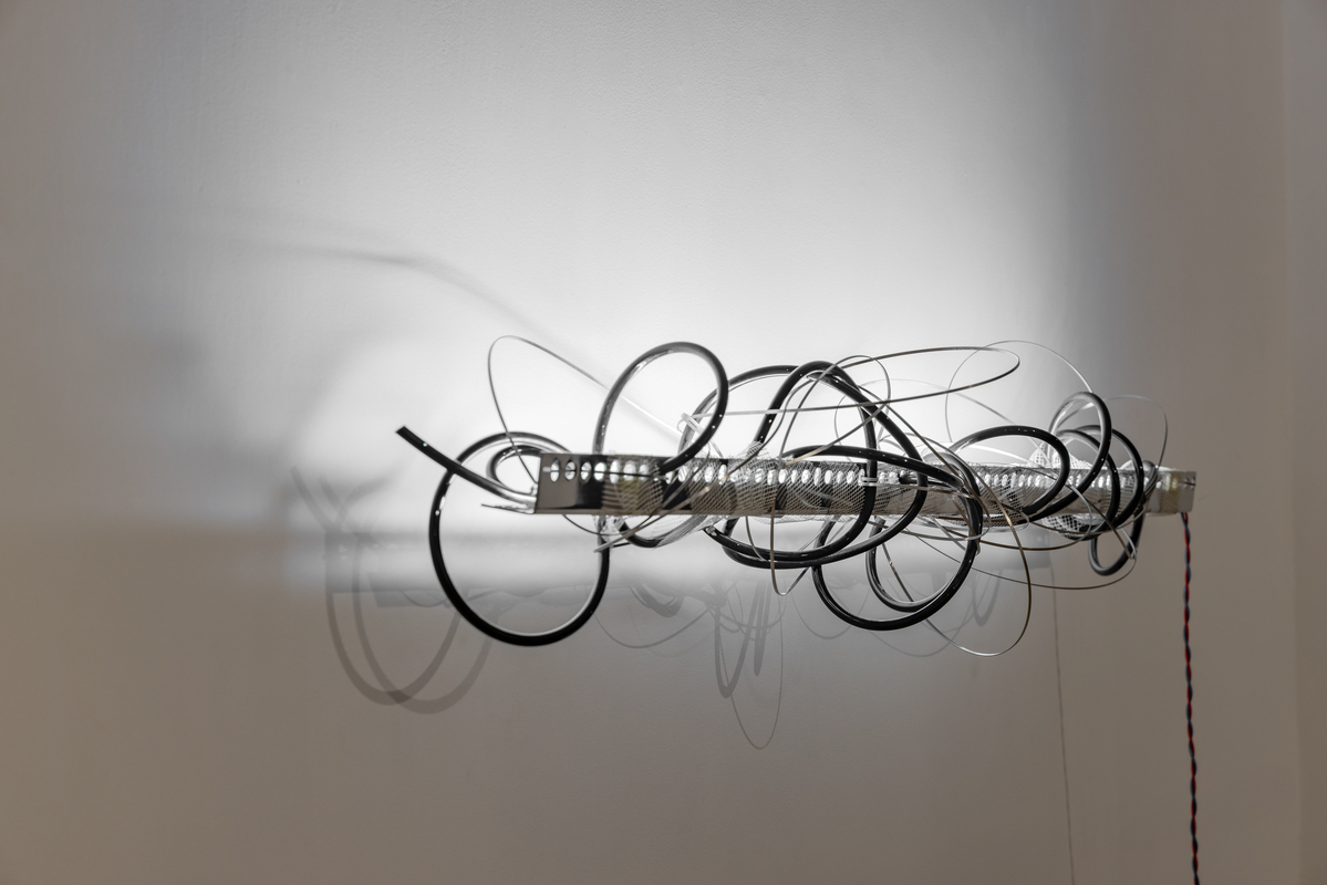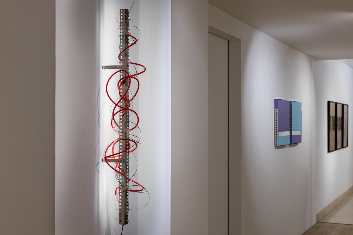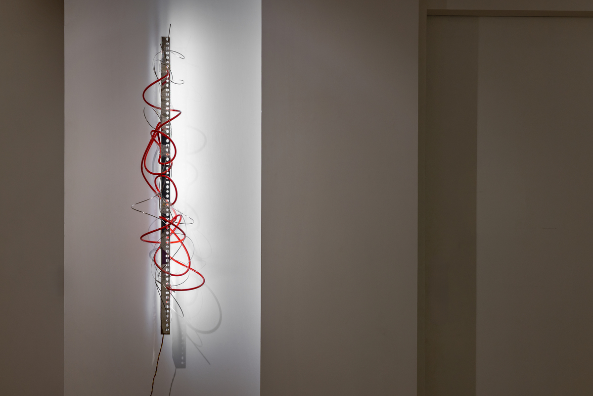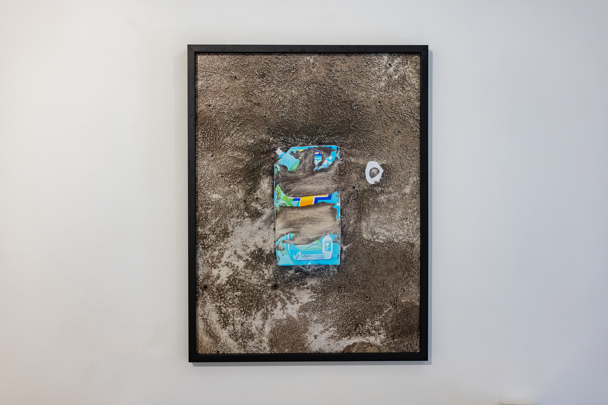 A new series of photographic works are also included in the exhibition. These portray debris partially buried in the wet sand of the Maharashtra coast. While both elegant and macabre, they speak of environmental degradation but also nature’s strength to resist man’s blunders. Completing the exhibition are two sculptures that resemble rockets or lighting fixtures, electrified amalgamations of technical flotsam and jetsam.