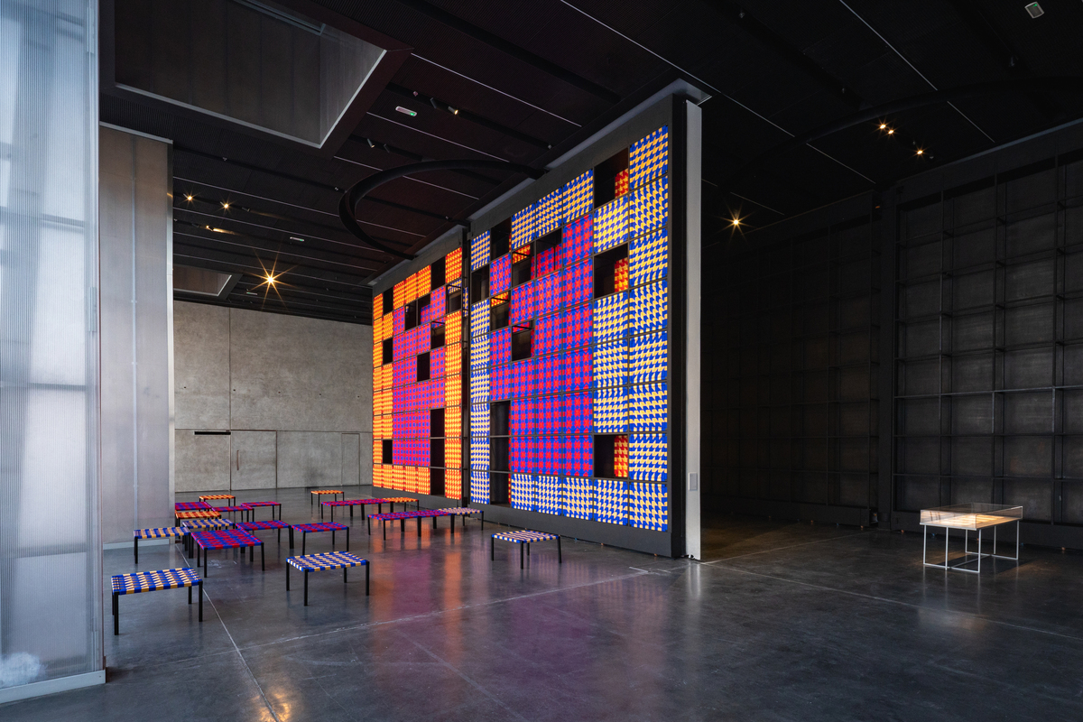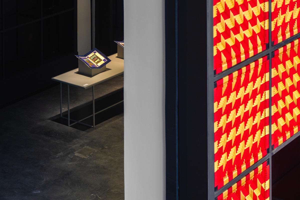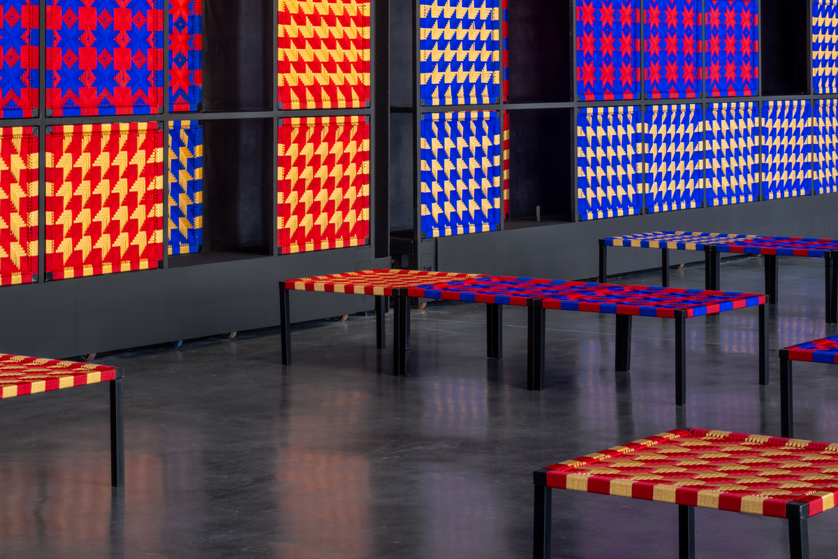 Behold the open pages of a manuscript, Opening Word of this New Scripture, which uses the internal architecture of Concrete as a scaffold for a new woven installation. Geometric patterns are woven from the bright colours of nylon rope used for the humble charpai, or common bed. The red and blue stars within the shifting patterns echo the palette the artist developed in response to the global impact of American interventionism, particularly in Pakistan. Echoing the embellished borders and frame within a frame device familiar to those who know the form of Indo-Persian painting, this spatial intervention also plays with our sense of depth perception and allows visitors to enter into and occupy the foreground.