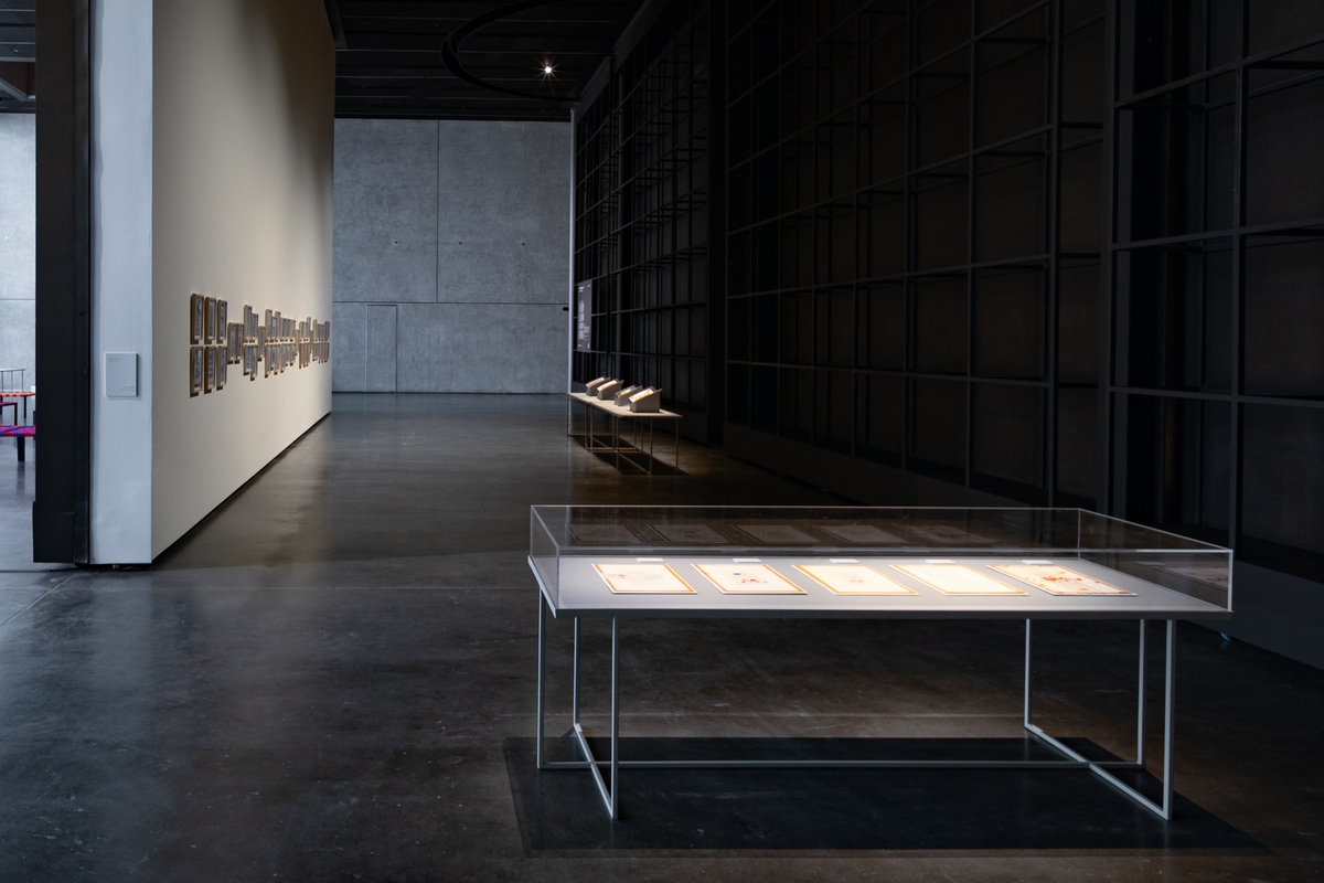 Imran’s iconic miniature paintings appear within vitrines, echoing the manner in which precious manuscripts are displayed. The gilded missile is a seductive yet lethal object, sometimes central, sometimes concealed, red and blue pigment seeping through the world as finely rendered foliage struggles to resist, resolutely contesting destruction with beauty. He layers in found book pages printed in Urdu, taken from popular literature with the sort of storytelling that may once have been illustrated by an artist.