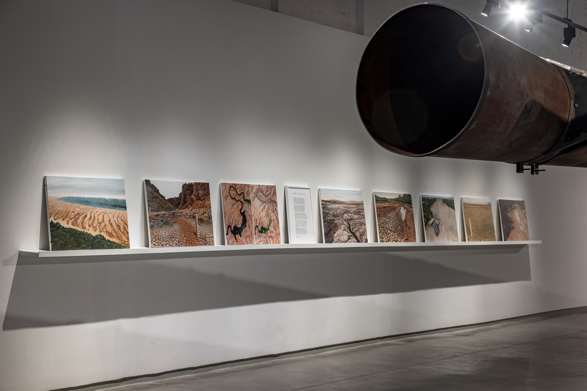 The wall installation entitled AquaAtlas comprises a series of 18 x 18 inch paintings. Each panel documents the water footprint of a particular nation through a graphic translation of found numerical data. A water footprint is a scientific tool showing the extent of water usage in relation to its consumption by its population. Kallat conflates the languages of hyper-realistic painting and conceptual graphics to convey a more nuanced portrait of the situations.