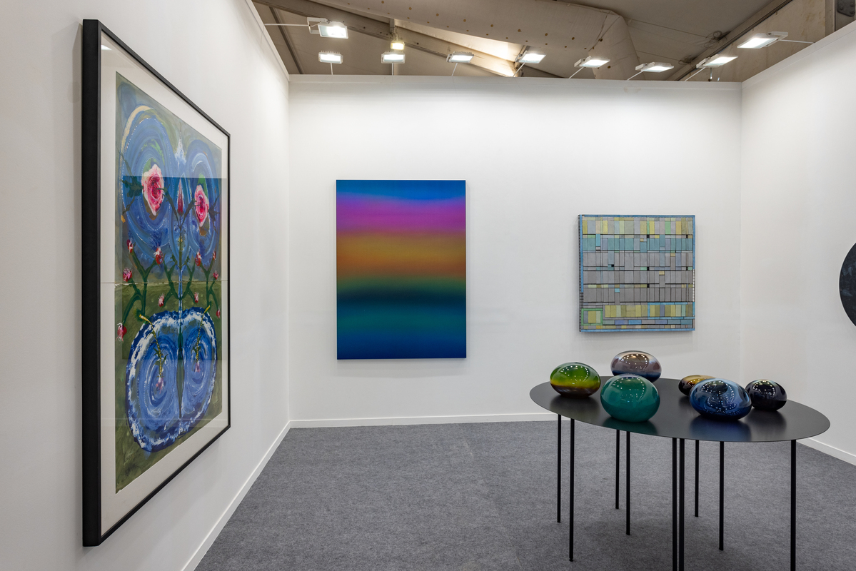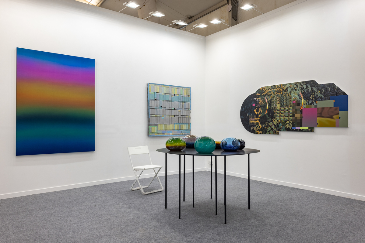 Artist duo Thukral & Tagra will have a work from their Arboretum series. Previously showcased at Nature Morte in both New Delhi (2023) and Mumbai (2024), the works juxtapose images of flora with pixelated geometrics representing technical glitches. The work aims to initiate a discourse on humans’ altering relationship with nature, as the cloud of technology engulfs us from every direction.International highlights from this year’s booth include German artist Matti Braun’s untitled painting on silk and a sculpture of iridescent glass spheres. Both pieces were exhibited at Braun’s first show in India, entitled "Noil," earlier this year at Nature Morte’s Mumbai gallery.The works exemplify Braun’s preoccupation with Indian history and traditions, which he was first introduced to when he visited the country 20 years ago. His relationship with India only deepened with subsequent visits, resulting in his practice being deeply affected by Indian personalities such as Satyajit Ray, Vikram Sarabhai and Rabindranath Tagore. 'Love and Validation’ from Oliver Beer’s Resonance Painting series offers an introduction to the British artist’s unique technique that freezes musical notes of the song he was listening to while creating each work. He lays a canvas covered with dry powder over a speaker playing music, and lets the powder create different patterns when exposed to the sound waves. Beer then freezes these patterns to create abstract works that are a visual representation of that particular song.