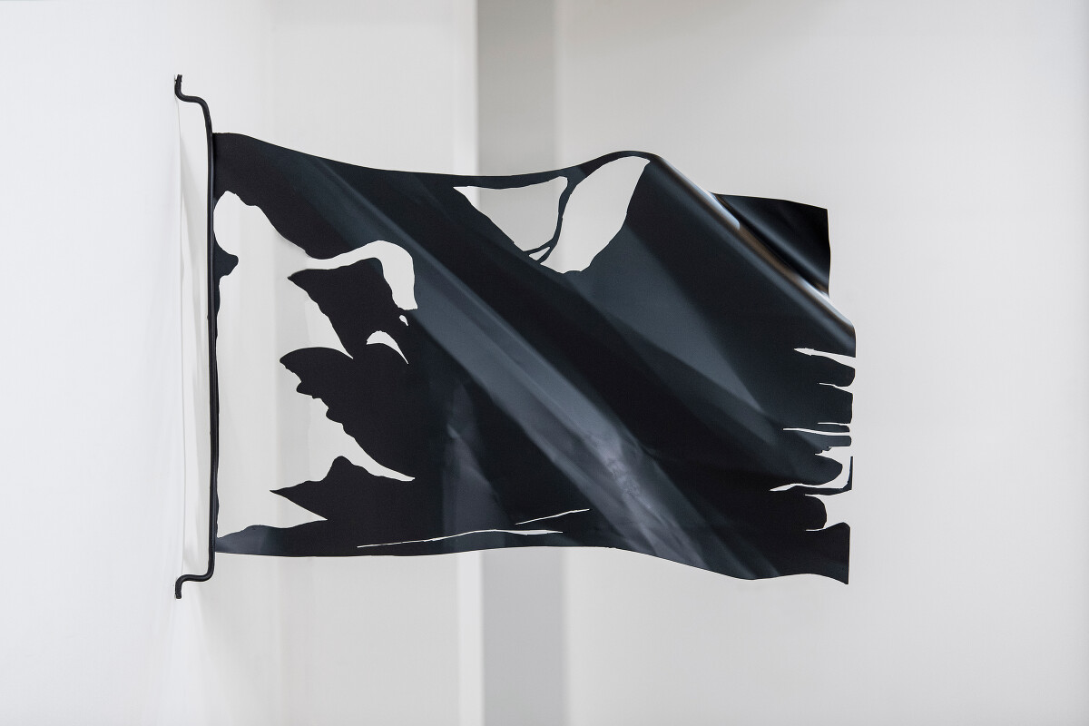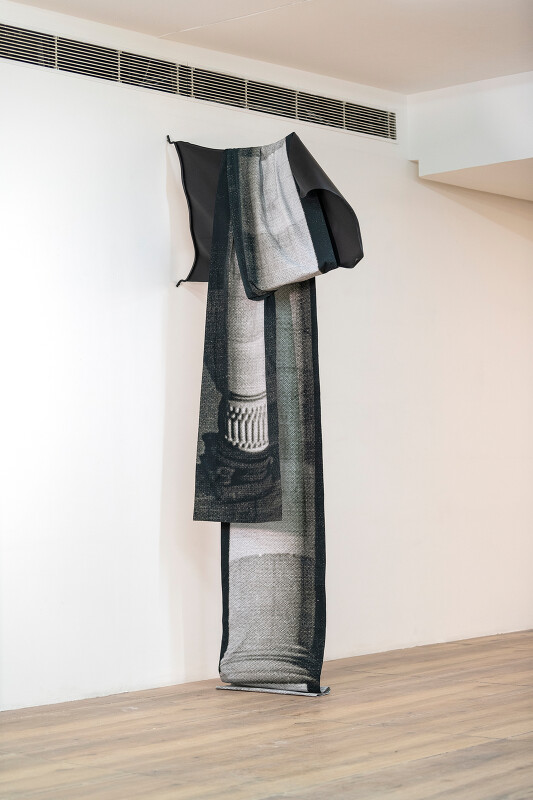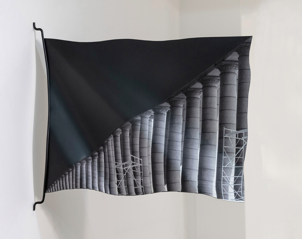 In Singh’s third flag, epitomized as a singular 227 inch fabric print, the column takes on a flaccidity, wrapping and constraining the now rigid flag that is halted in motion. The interdependence between the two also suggests a reliance on architecture to tether and uphold the weight of the systems in place, as is done by the two slight nails which anchor the metal flag to the building it is displayed within.