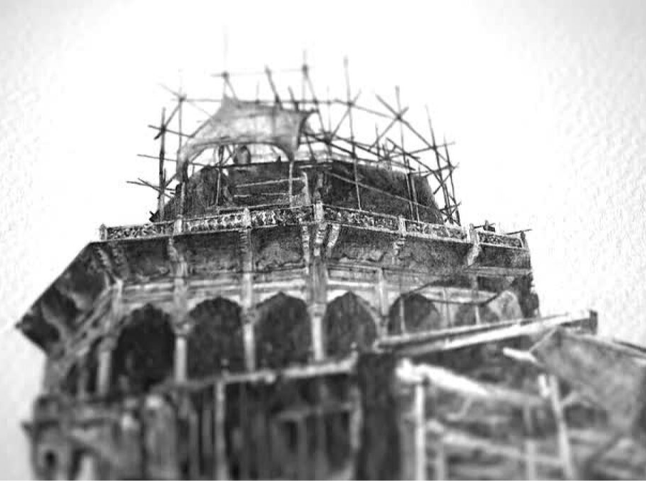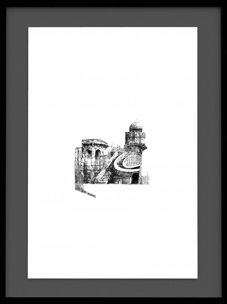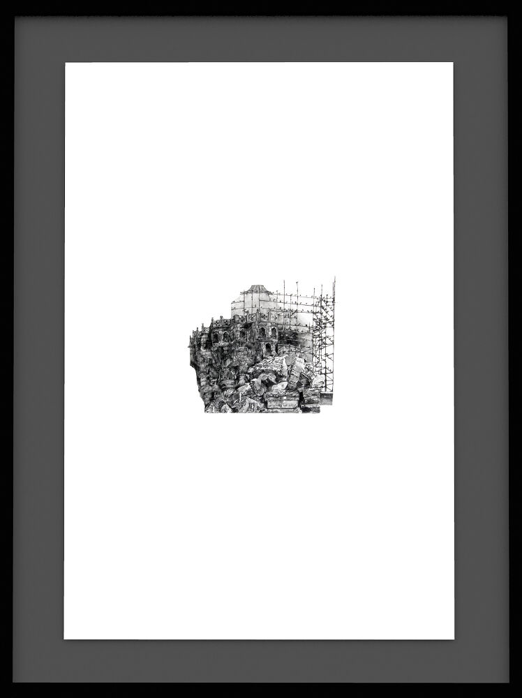 The Hybrid Amalgamation series are graphite drawings for possible totemic structures that combine elements of a city’s architecture from various cultures, religions and times. Layered onto one another, they present moments of reformation through the construction, restoration and destruction of architecture. The drawings include facades, fragmentations, skeletal frameworks and scaffolding; and through them the lives, stories and agency of people.