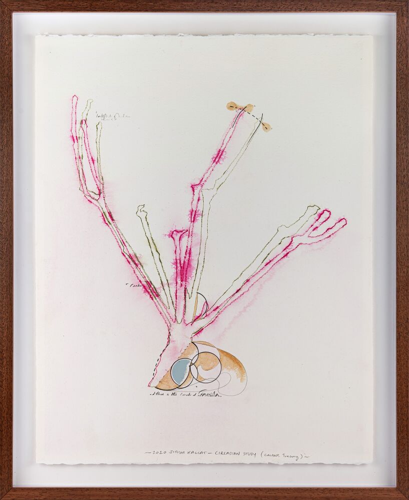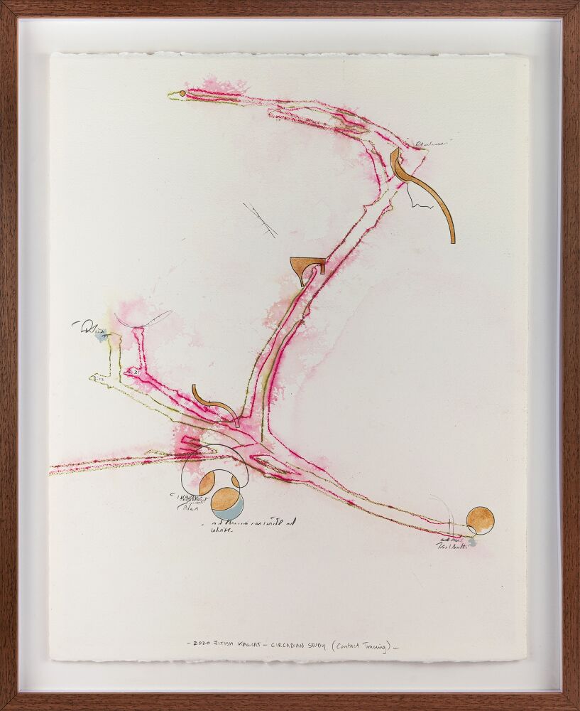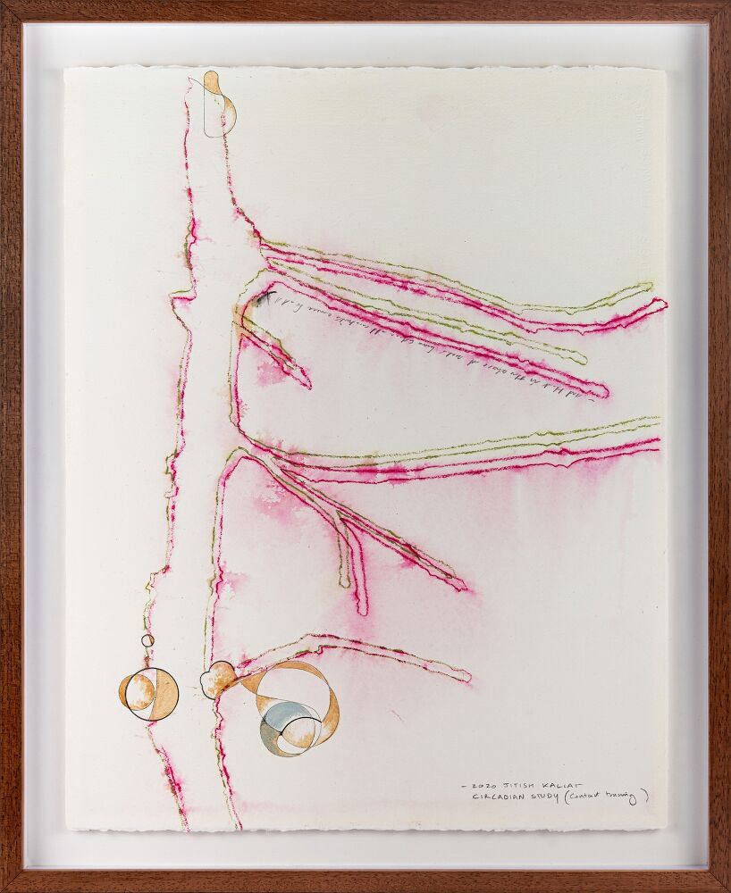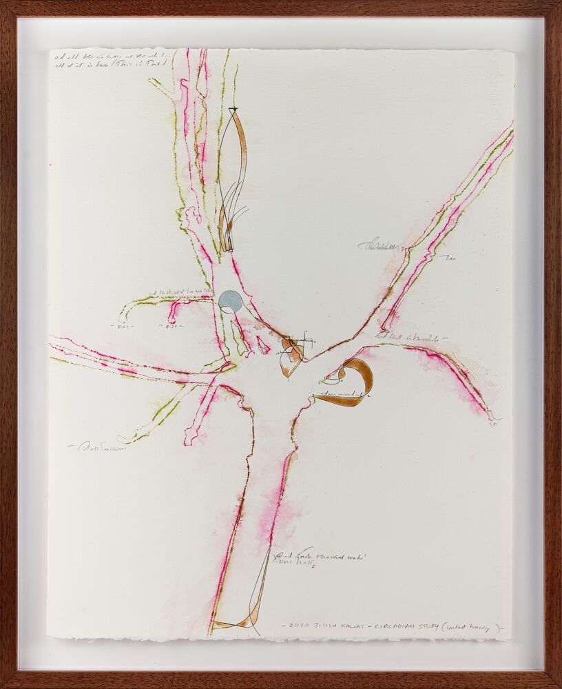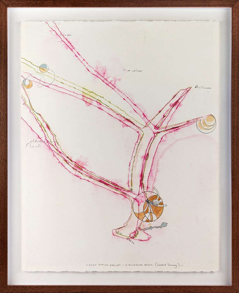 His most recent series of drawings titled Circadian Study (contact tracing) began as an accidental activity during a fortnight of self-isolation at his studio, after an overseas trip in March 2020. One of his daily routines was watering the plants on the studio terrace coupled with the practice of tracing contours of shadows from fallen twigs.